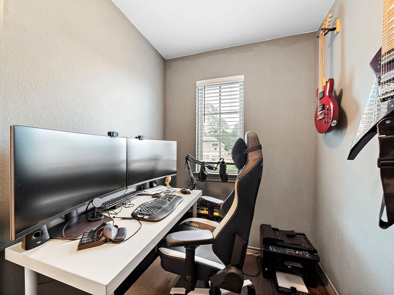 This compact home office features a modern, minimalist design with calming gray walls that provide a neutral backdrop. A wide white desk holds a dual-monitor setup, ideal for productivity, accompanied by a comfortable ergonomic chair in black and white leather. Practical accessories such as a microphone mounted on a boom arm, a curved keyboard, and a gaming mouse enhance functionality. Natural light filters through the window with white blinds, adding brightness to the small space. On one wall, two electric guitars hang as stylish decor accents, infusing personality and creativity. A printer sits neatly beneath the desk, completing the efficient workspace.