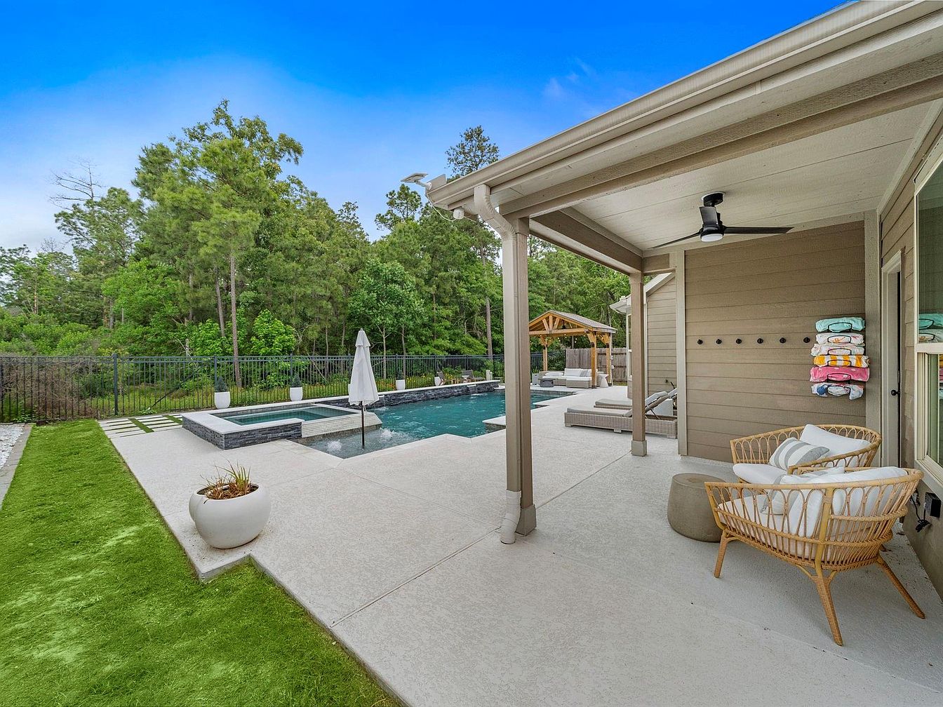 This outdoor space features a spacious covered patio that opens to a contemporary swimming pool and spa. Neutral taupe siding and white trim complement the concrete patio, providing a clean and modern aesthetic. Under the covered area, wicker furniture with white cushions creates a cozy seating nook, perfect for relaxation. A ceiling fan overhead adds comfort. The pool area includes a sleek, dark stone accent around the spa, with an uncluttered, minimal design bordered by a black metal fence. Lush greenery and tall trees frame the space, bringing tranquility and natural beauty to this inviting backyard retreat.