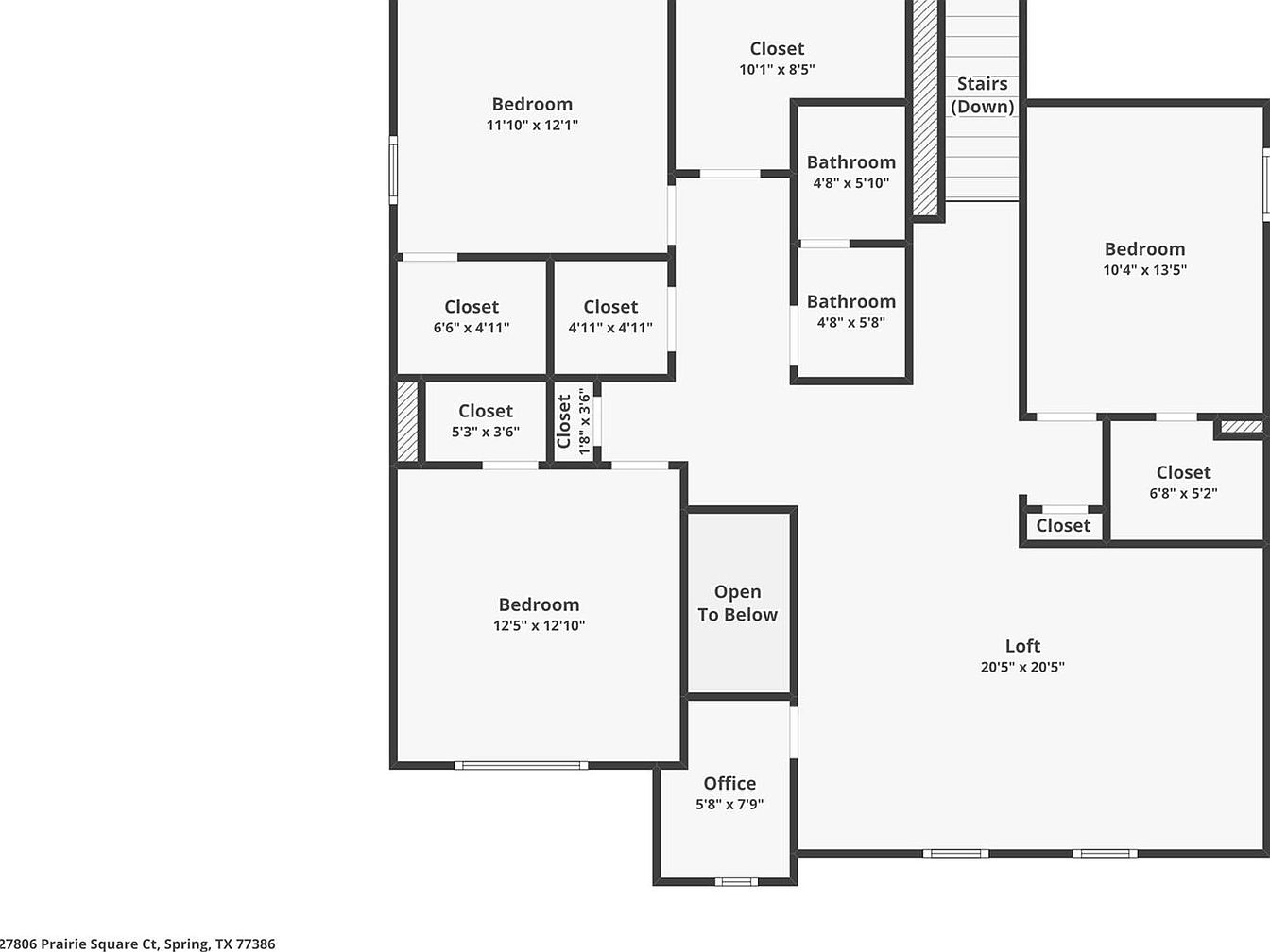 This second-floor plan reveals a spacious and thoughtfully designed residential area. The layout includes three bedrooms, each paired with multiple closets, optimizing storage. Two full bathrooms are centrally located near the bedrooms for convenience. A large loft area measuring over 20 feet square provides versatile space for relaxation or entertainment. Adjacent to the loft is a compact office, ideal for work or study. An open-to-below section offers architectural interest and a sense of openness. Stair access connects this floor to lower levels, emphasizing a functional yet comfortable living environment.