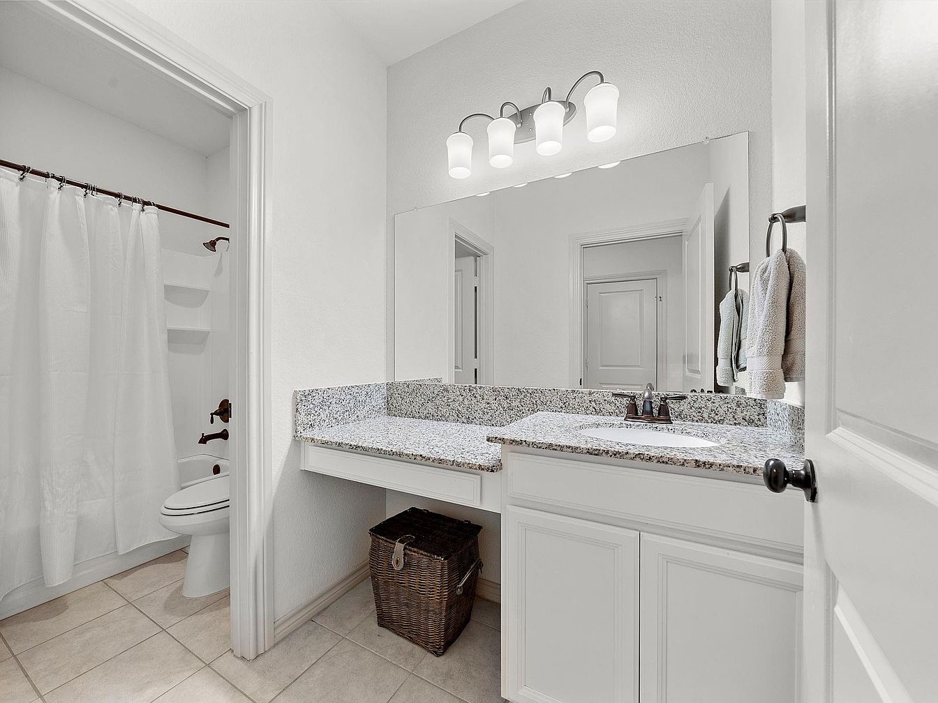 This bathroom features a clean and bright vanity space with a spacious granite countertop extending to create a small seated area. White cabinetry below provides subtle storage, contrasted by dark hardware and a matching faucet that add a touch of elegance. A large, frameless mirror runs the length of the counter, reflecting light from the modern four-bulb fixture above. Adjacent is a connected shower area enclosed by a white shower curtain, with built-in shelving and dark bronze fixtures that complement the faucet. The beige tiled floor ties the space together with a soft neutral tone.