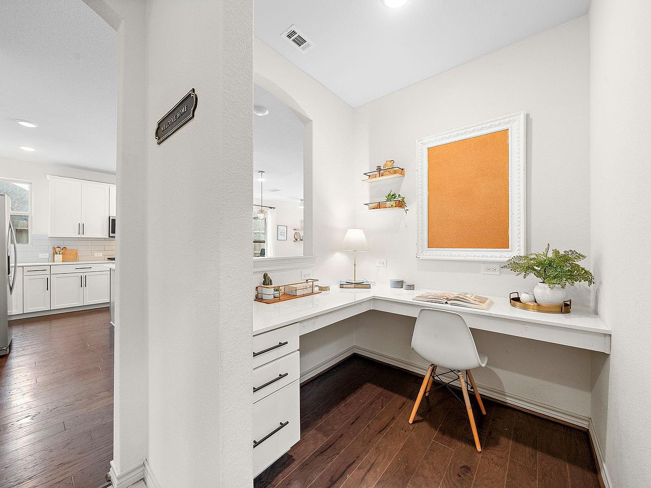 This cozy home office nook is tucked into a quiet corner, defined by soft white walls and rich dark hardwood floors that add warmth. The built-in L-shaped desk provides ample workspace with sleek white drawers that feature modern black handles for contrast. A white chair with wooden legs complements the clean, minimalist aesthetic. On the desk, subtle decorative elements such as a small lamp, potted plants, and a tray with accessories create a welcoming and functional environment. A large white-framed cork board on the wall adds practicality and character. Open shelving above the desk displays small potted plants and styled decor, enhancing the calm, organized feel of the area. The nook connects visually to the kitchen, sharing the open layout and bright ambiance.