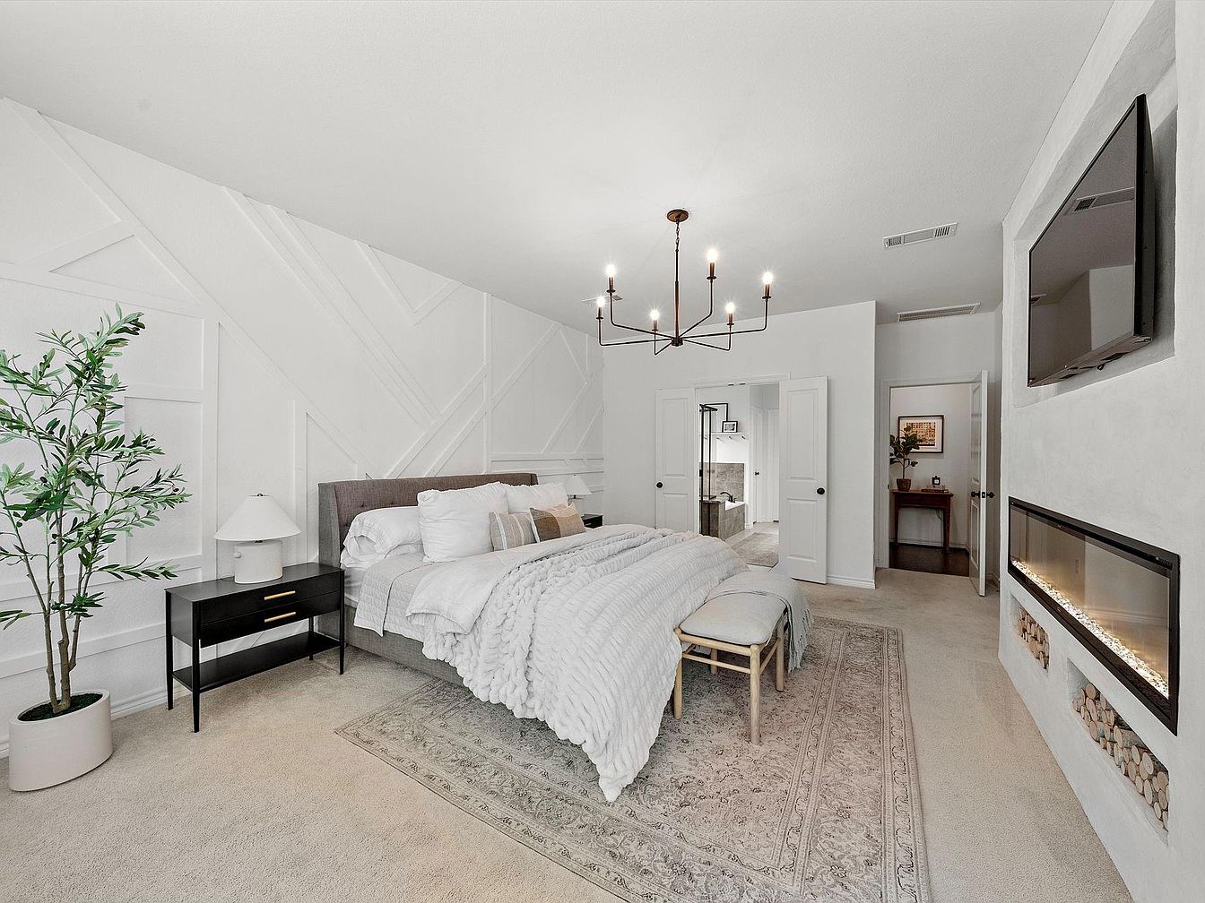 This master bedroom exudes calm sophistication, featuring a neutral palette dominated by soft whites and greys. The plush bedding layered with textured throws invites relaxation, complemented by a subtle patterned area rug anchoring the space. A modern black nightstand contrasts the light tones, paired with a minimalist lamp and a tall indoor plant adding natural greenery. An elegant chandelier with exposed bulbs hangs centrally, enhancing the room’s high ceiling. The wall showcases distinctive geometric paneling, while a built-in fireplace beneath a mounted flat-screen TV offers both warmth and entertainment, creating a cozy yet stylish sanctuary.
