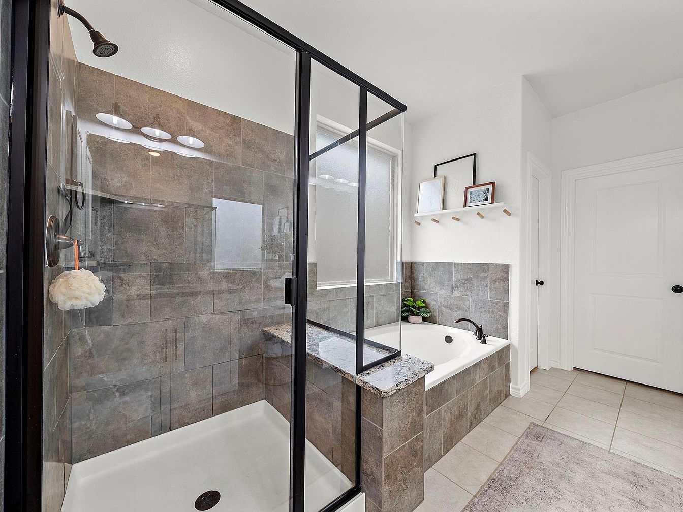 This bathroom area features a modern and functional layout, integrating both a glass-enclosed shower and a tiled bathtub side by side. The shower, framed with black metal accents, contains large, earthy-toned tiles that extend to the surrounding wall, enhancing continuity and warmth. The bathtub shares the same tile design for a cohesive look and includes a sleek, dark faucet. Natural light filters through a frosted window positioned above the tub, balancing privacy and brightness. Minimalistic wall hooks and simple framed art on a narrow shelf add subtle decorative touches, while a light neutral-toned floor and area rug complete the serene aesthetic.