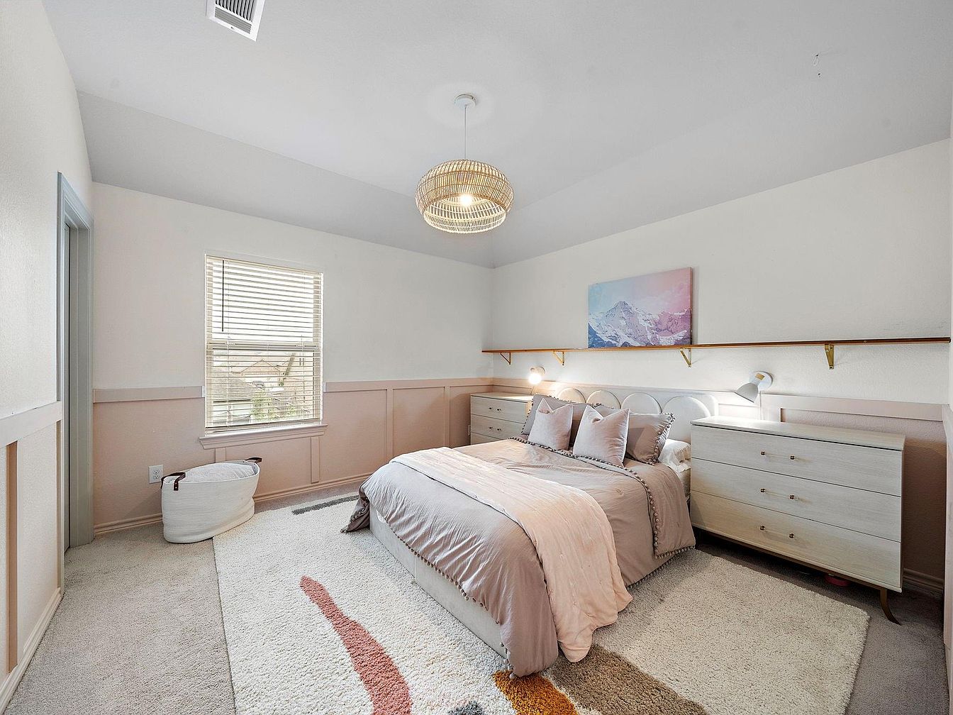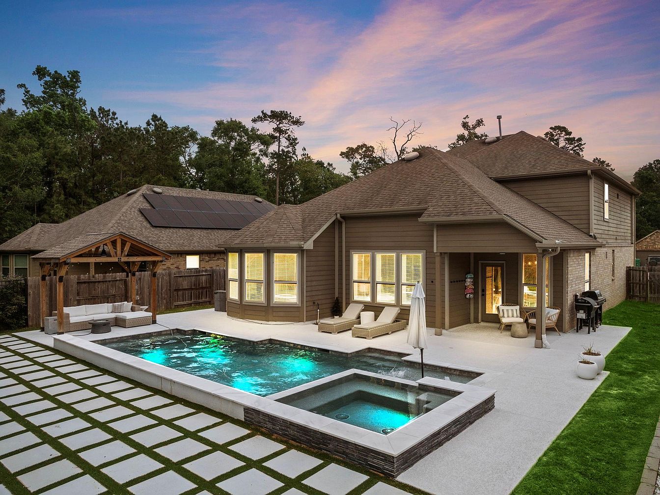 This stunning home at 27806 Prairie Square Ct is situated in the serene Harmony neighborhood of Spring, TX. Architecturally, it features a modern suburban style with a focus on outdoor living and comfort, highlighted by clean rooflines and a mix of brick and wood siding. The property includes a beautifully designed backyard oasis with a heated gunite pool, an expansive patio, and a shaded pergola, tailored for relaxation and entertaining throughout the year. The home’s interior is thoughtfully laid out with 5 spacious bedrooms and 3 bathrooms, including a convenient secondary bedroom and full bath on the first floor perfect for guests or multigenerational use. The primary suite upstairs offers a cozy retreat with a custom fireplace and an oversized closet cleverly converted into a private office space. This home is listed at $595,000, offering a perfect combination of privacy—located on a quiet cul-de-sac with no rear neighbors—and luxury within a family-friendly community.