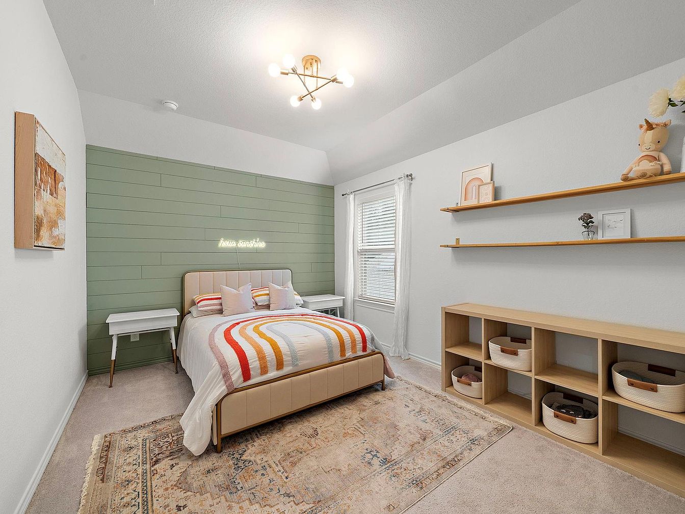 This compact bedroom corner features a muted green shiplap accent wall behind a beige upholstered bed with a quilted headboard, dressed in a white comforter adorned with soft rainbow stripes. Two white nightstands with tapered wooden legs flank the bed, while a patterned area rug with faded earth tones adds warmth against the light carpet floor. A modern brass ceiling light fixture casts ambient illumination. On the adjacent wall, minimalist wooden floating shelves and a low cubed storage bench display subtle decor and organizational baskets, complementing the room’s clean, cozy, and inviting aesthetic.