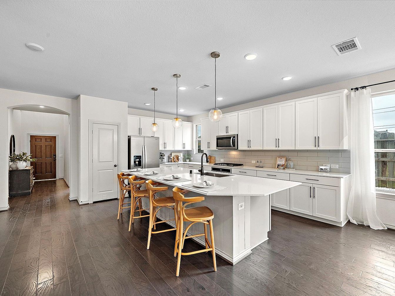 This open-concept kitchen highlights a spacious island with a white quartz countertop that comfortably seats four with stylish wooden bar stools. The cabinetry is painted a crisp white, complemented by sleek modern hardware and a light gray subway tile backsplash for subtle contrast. Stainless steel appliances, including a refrigerator and microwave, are integrated seamlessly along the perimeter. Three pendant lights hang over the island, adding warmth with their clear glass globes. Dark hardwood flooring provides depth and balances the bright tones, while a large window draped with sheer curtains allows natural light to illuminate the space.
