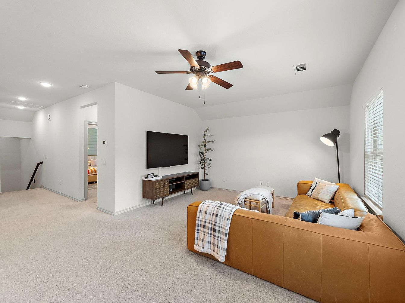 This cozy upstairs living area features a light, neutral color scheme dominated by soft beige carpet and crisp white walls, creating an airy and inviting atmosphere. The L-shaped caramel leather sectional provides a comfortable seating arrangement that complements the warm wooden tones of the mid-century modern media console below a wall-mounted flat-screen TV. Accent pillows and a plaid throw add texture and subtle contrast, while a tall black floor lamp and a potted artificial tree bring balance and additional light to the corner. A ceiling fan with wood blades and multiple lights hangs centrally, enhancing both air circulation and illumination in this relaxing space off the stairwell.