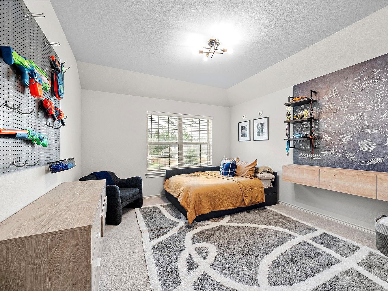 This kid’s bedroom features a bright and airy layout with white walls and a large window allowing natural light to fill the space. The bed is dressed in a warm mustard yellow comforter, complemented by blue and beige pillows, placed on a dark upholstered frame. A plush, modern area rug with abstract white and gray lines adds cozy style beneath the bed. Decorative and functional elements include a mounted basketball chalkboard wall with whimsical doodles, floating wooden shelves displaying trophies and small toys, and a pegboard organizing colorful toy guns. A sleek wooden dresser and a black armchair complete this playful yet organized retreat.