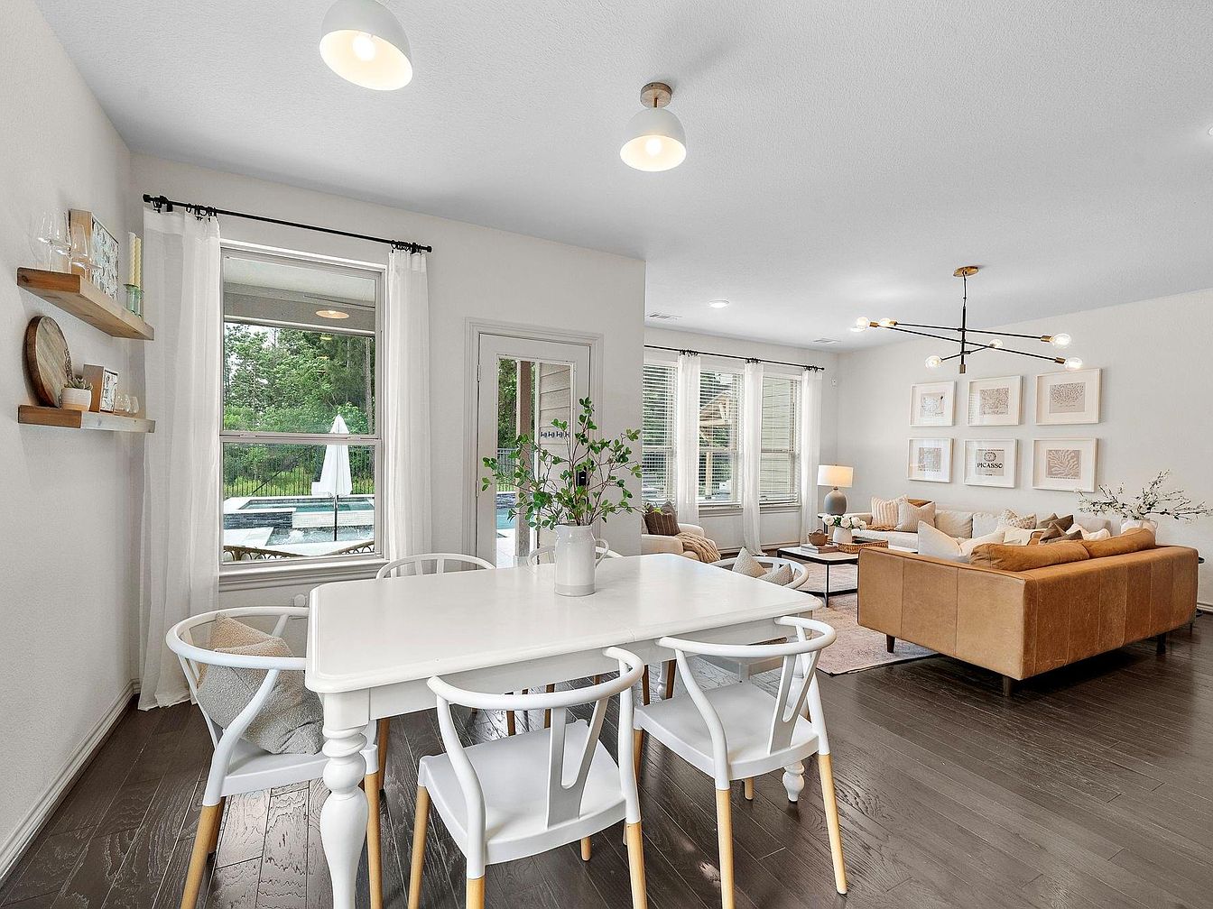 This inviting open-plan space combines a cozy dining area with a spacious living room. Soft neutral tones dominate the palette, with white walls and light-colored furnishings contributing to a bright, airy ambiance. The dining table is white with turned legs, paired with modern white chairs featuring wooden legs that add warmth. Sheer white curtains softly frame the windows, allowing natural light to filter through while providing views of an outdoor pool area. The living room showcases a warm tan leather sectional accented by plush neutral cushions and a light area rug. Contemporary lighting fixtures enhance the modern farmhouse aesthetic, while wall art creates a gallery feel that anchors the room elegantly.