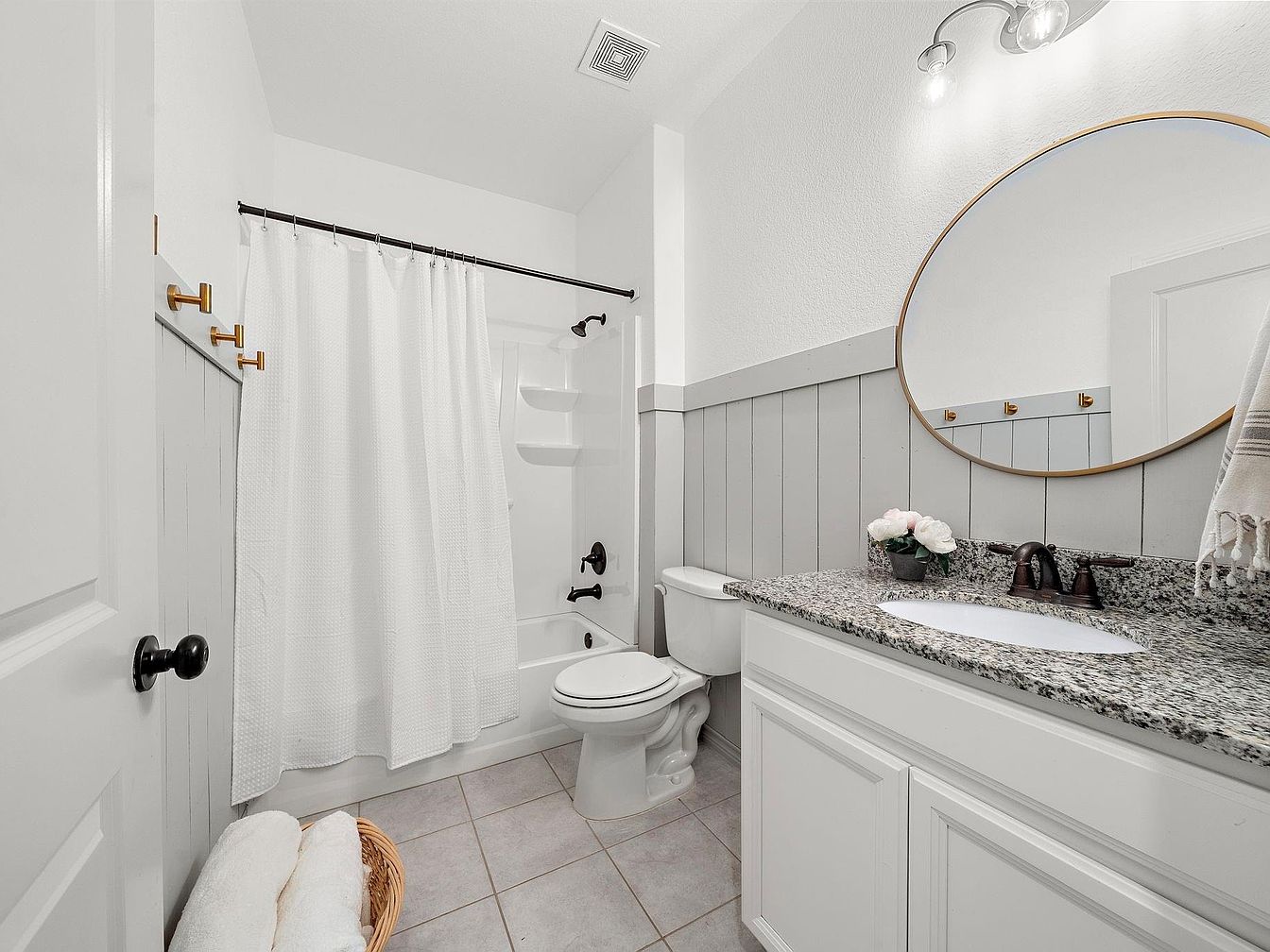 This compact bathroom combines functionality with subtle charm through its neutral color palette dominated by soft gray wainscoting and crisp white walls. The vanity features a speckled granite countertop paired with a white undermount sink and dark bronze faucet, creating a refined contrast. An oval mirror with a thin gold frame adds a modern yet warm accent above the sink. The shower-tub combo is enclosed by a simple white textured curtain on a dark rod, complemented by matching dark fixtures. A basket with folded towels and brass hooks for hanging adds thoughtful practical touches. Floor tiles in soft gray enhance the clean, serene feeling of the space.