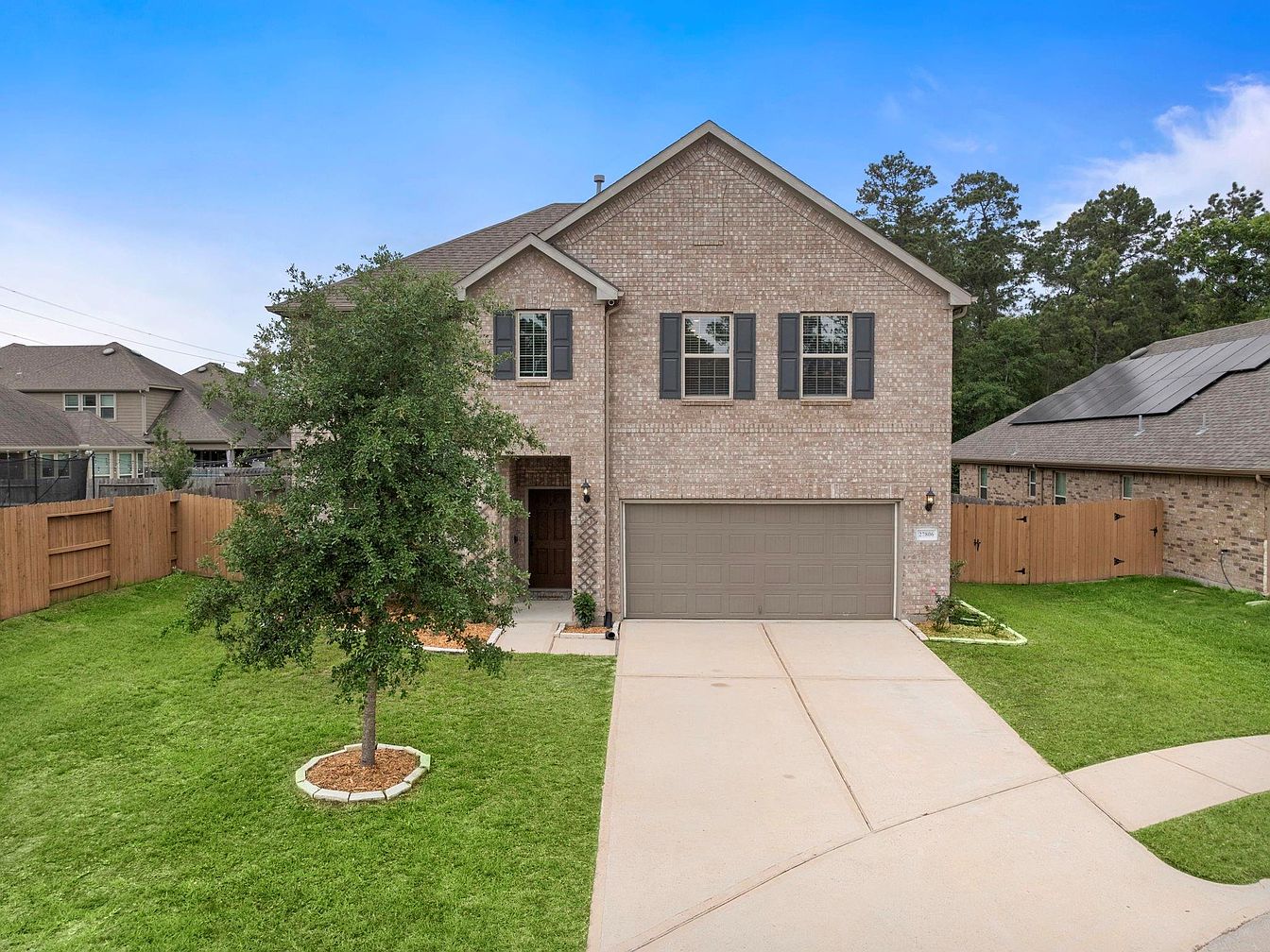 This charming two-story home showcases a neutral, light tan brick façade complemented by dark gray window shutters and a matching garage door. The roof features muted gray shingles, blending subtly with the brickwork. A neatly manicured front yard enhances curb appeal, centered by a vibrant green tree surrounded by a circular stone border with mulch. The concrete driveway leads directly to the two-car garage, with a small concrete path diverting toward the inviting front entrance recessed under a covered alcove. Wooden fencing on both sides adds privacy, while neighboring homes sit comfortably close, completing a warm suburban streetscape.