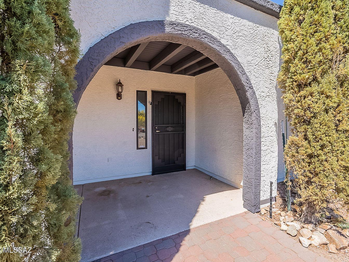 This sheltered front porch features a sturdy stucco archway painted in a soft cream tone with contrasting darker trim accentuating the arch’s curve. The floor combines smooth concrete within the porch area and a red brick patterned pathway leading up to it, enhancing tactile contrast. A dark, wooden door with geometric panel designs and a small vertical window beside it adds visual interest and allows natural light into the entry. Rustic-style outdoor lighting beside the door hints at a welcoming ambiance. Lush evergreen shrubs frame the entrance, integrating natural elements with the Mediterranean-inspired architectural style.