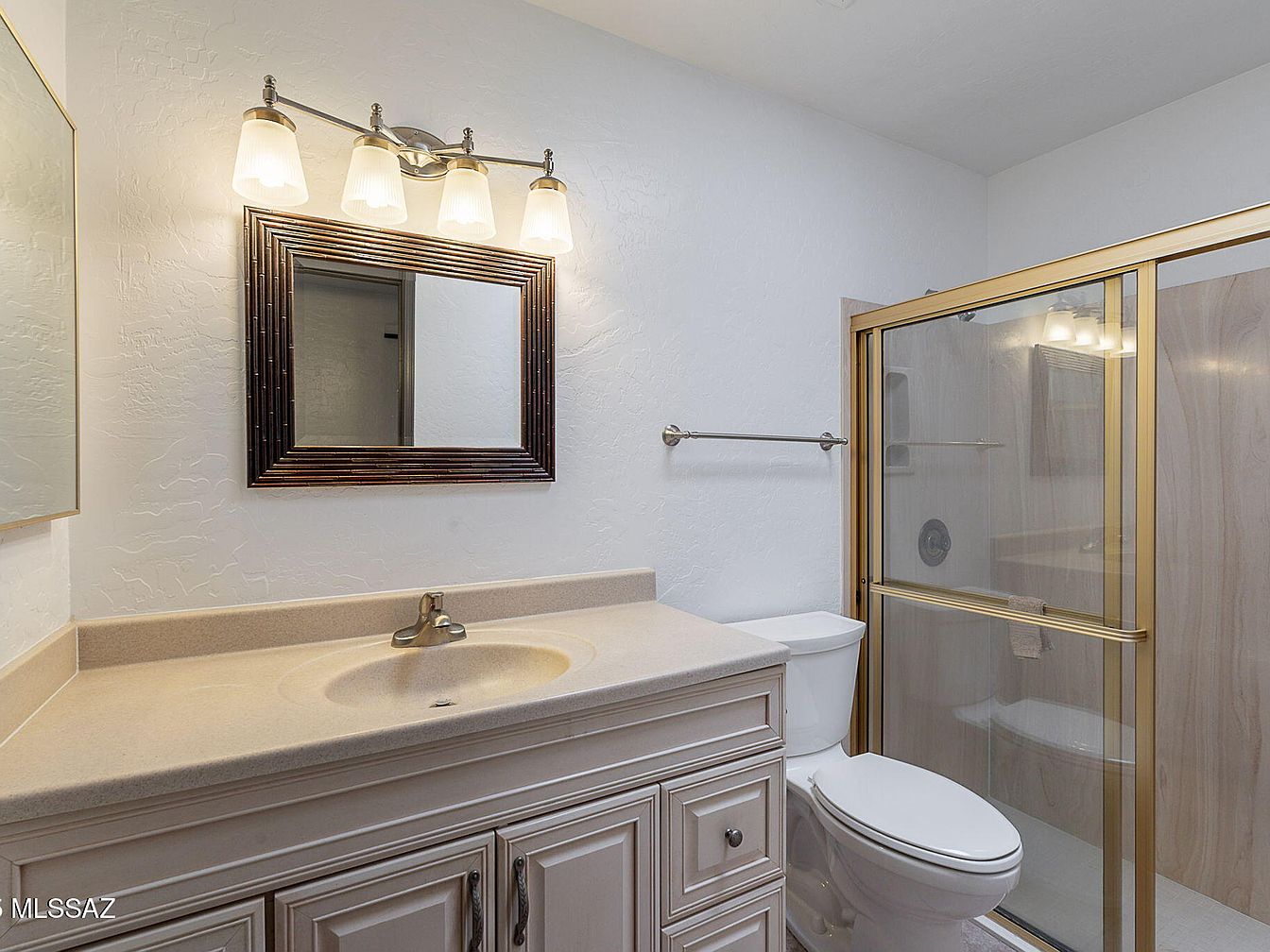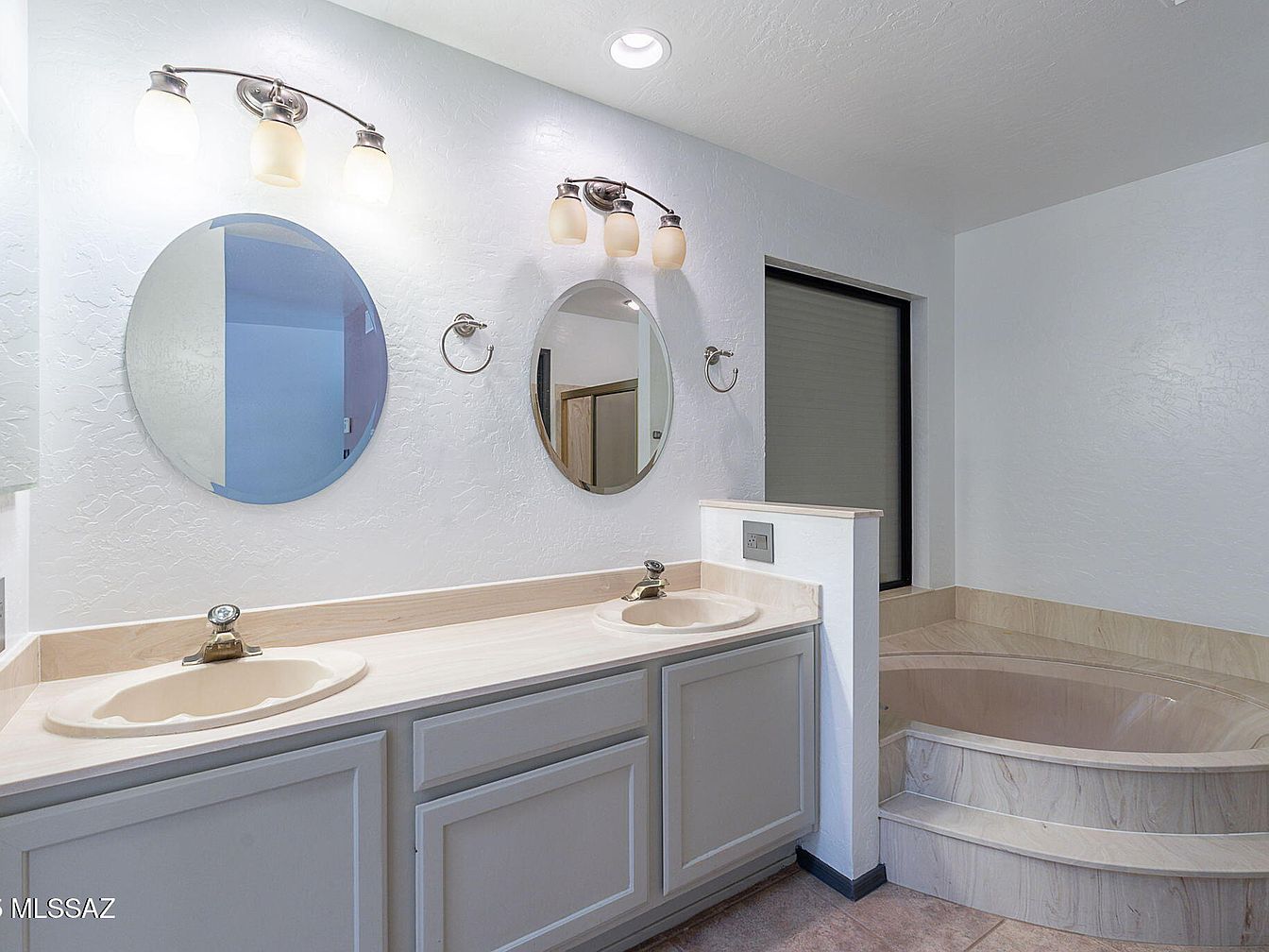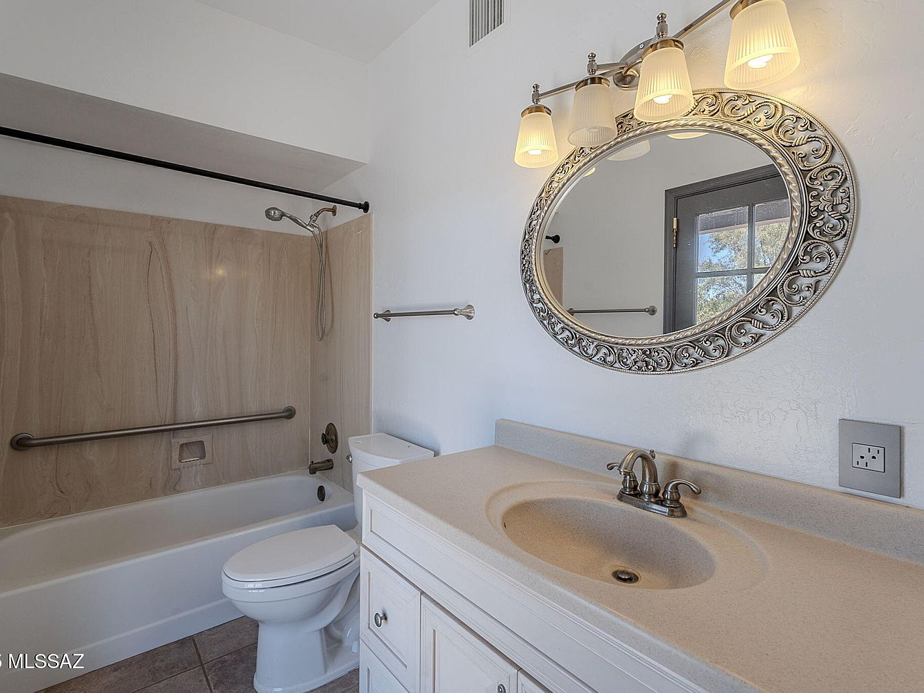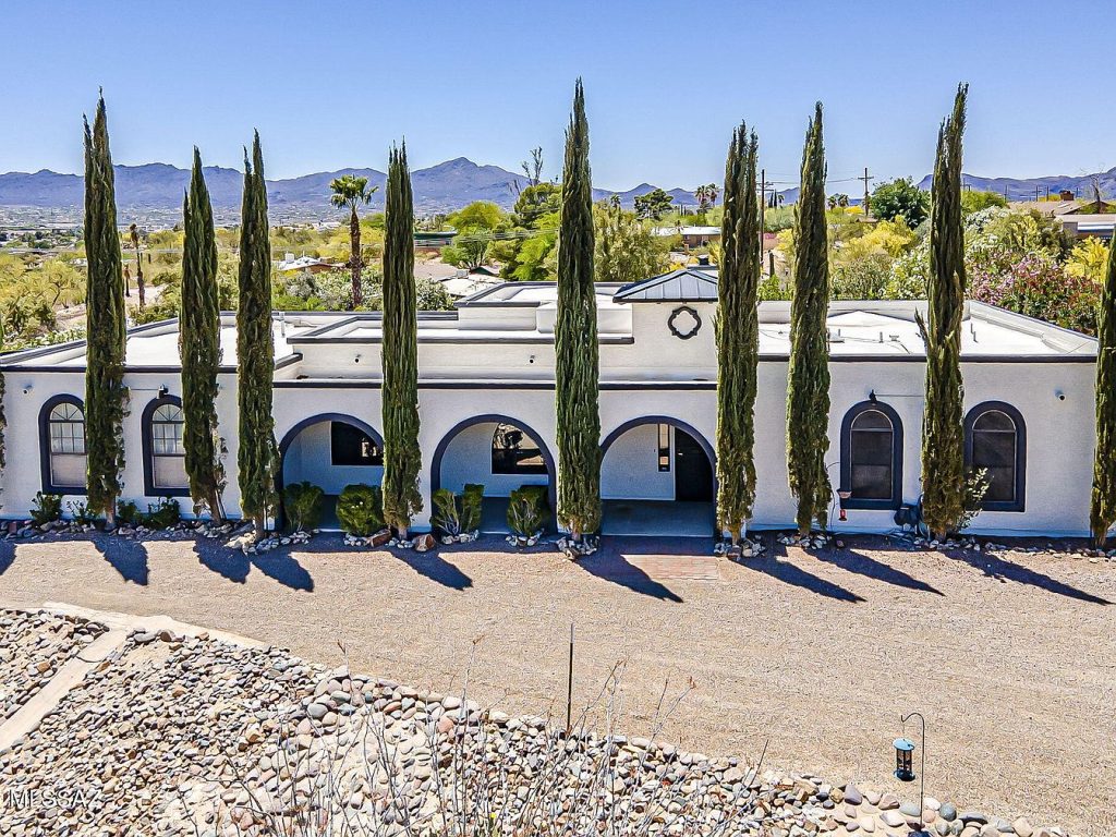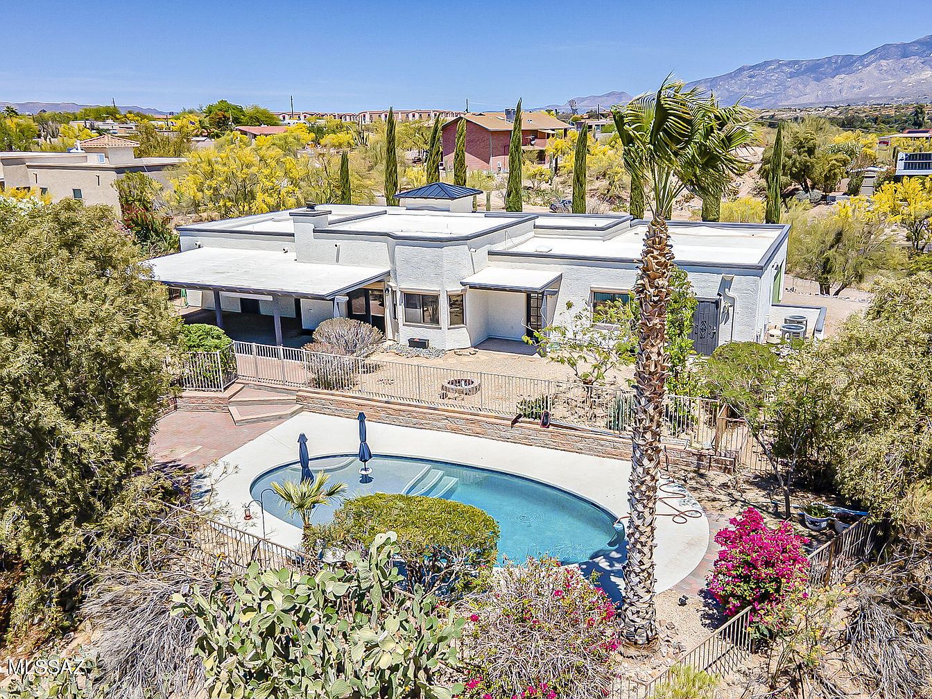 This stunning home, located in Tucson, AZ, is a unique representation of Southwestern architectural style with its arched facade and warm-toned exterior. Situated on an elevated 0.83-acre lot, the property offers breathtaking views of the surrounding mountains and city skyline. The spacious residence spans 2,426 square feet and features a thoughtfully designed split bedroom plan that includes four bedrooms, among them two primary suites, ideal for multigenerational living or guest privacy. Built with charm and elegance, this home boasts several recent renovations and upgrades that enhance both comfort and convenience. Notable improvements include a new dishwasher installed in 2023, resurfaced saltwater pool and deck (2024), updated pool filter and pump (2023), and a roof re-coating completed in 2024. The interior is bright and inviting, with elegant tile flooring, rolling shutters, electronic shades operated by switches, and abundant natural light throughout. Additional modern amenities include two AC units installed in 2021, a new water heater from 2023, and a comprehensive security system. Outdoor living is a highlight with generous covered patios at both the front and back of the home, lush fruit trees, and a private backyard oasis centered around the sparkling saltwater pool. The large garage offers separate storage and a dedicated workshop, supporting a lifestyle that blends style, functionality, and comfort seamlessly. Listed at $710,000, this rare property perfectly combines an exceptional location, comprehensive upgrades, and elegant design.