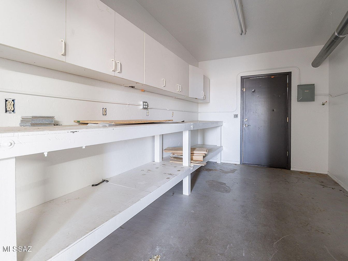 This spacious garage area features an elongated white workbench running along one wall, equipped with open lower shelving ideal for storing tools or materials. Above the workbench, a series of white wall-mounted cabinets provide additional storage, maintaining a clean and organized look. The space is painted in a simple white palette, contrasted by a dark steel door at the far end which adds an industrial touch. The concrete floor shows signs of use and wear, emphasizing this room’s utilitarian purpose. Exposed conduit and a visible overhead plumbing pipe contribute to the functional, no-frills aesthetic.