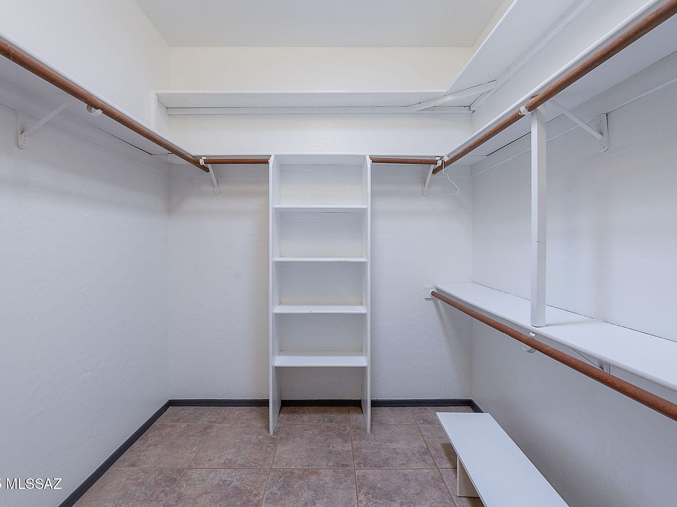 This spacious walk-in closet offers an efficient layout with white walls and built-in shelving at its center, perfect for folded items or accessories. Surrounding the shelves, timber rods extend along three sides at varying heights, providing ample hanging space for clothing. The neutral tile flooring adds a clean, durable element that complements the crisp white shelving and walls. Minimalist design is emphasized through simple, functional elements, creating a bright, organized space ready for personalized storage solutions. The open, airy feel highlights both practicality and understated elegance in the closet’s design.