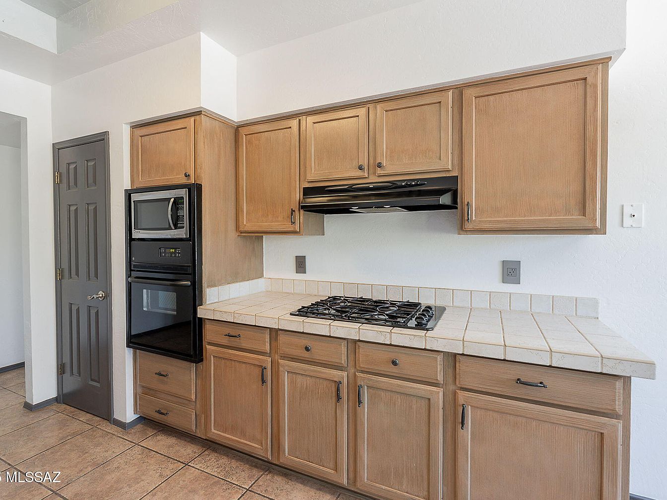 This kitchen section features a tiled countertop with a built-in gas cooktop, framed by warm, natural wood cabinets both above and below. The cabinetry carries a slightly rustic finish, adding texture and character to the space. Above the cooktop, a sleek black range hood complements the modern black built-in oven and microwave stack on the left side. The space is accented by neutral tones with beige tiles on the countertop and backsplash, gray door and outlet covers, and terracotta-hued floor tiles, creating a balanced and inviting cooking area that blends function and subtle charm.