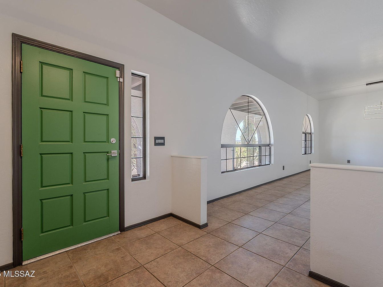 This entryway greets visitors with a bold green front door framed in dark trim, adding a striking contrast to the otherwise neutral setting. The walls are painted soft white, creating a bright and clean atmosphere that reflects natural light streaming through two large arched windows with black grid accents. The warm-toned, large square ceramic tiles covering the floor give a practical yet inviting feel. Low half walls along the hallway define the space subtly without closing it off, while modern light fixtures hint at contemporary styling blending with classic architectural elements.