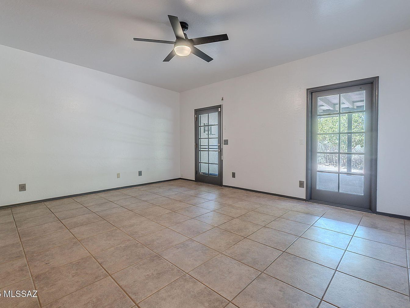 This bright, open space features large light beige ceramic tiles that bring warmth and continuity to the floor. White walls provide a clean, neutral backdrop, contrasting subtly with the charcoal-gray trim and doorframes that add modernity and definition. Two glass-paneled doors offer access to exterior areas, flooding the room with natural light and creating a seamless indoor-outdoor connection. A sleek black ceiling fan with a modest light fixture hangs centrally, blending function with minimalistic style. The room’s simplicity and strong natural light make it adaptable for entry or sunroom use, emphasizing openness and modern practicality.
