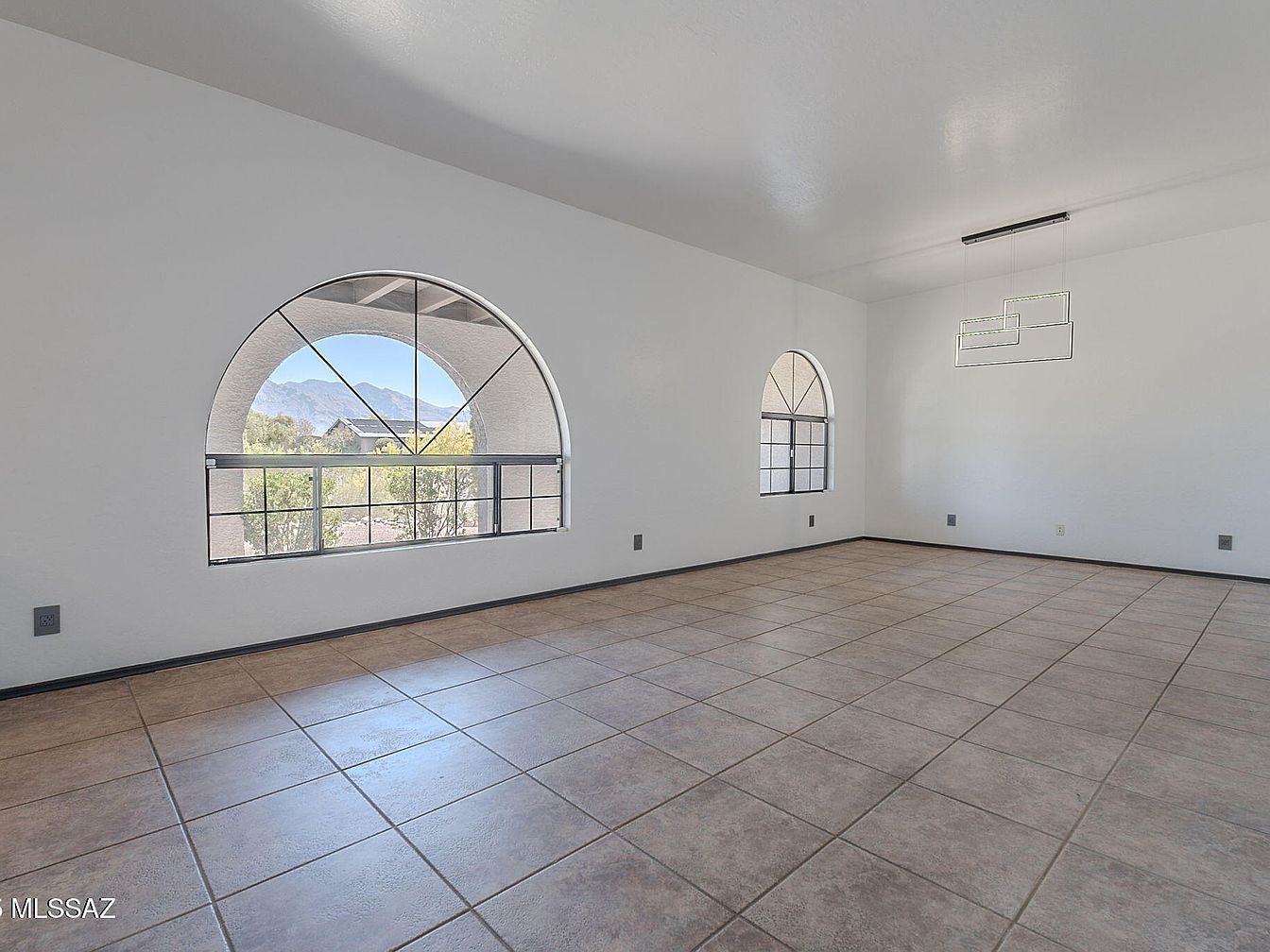 This spacious dining area features a clean, minimalist design with large, square beige tiles covering the floor, creating a durable and easy-to-maintain surface. The walls are painted crisp white, enhancing brightness and complementing the natural light flowing in through two striking arched windows. These windows add architectural interest and frame scenic views of distant mountains and greenery, perfectly blending indoor and outdoor elements. A modern, rectangular pendant light fixture with geometric design hangs subtly from the ceiling, balancing the room’s simplicity with sophisticated, contemporary style. The overall atmosphere is open and inviting, ideal for hosting meals.