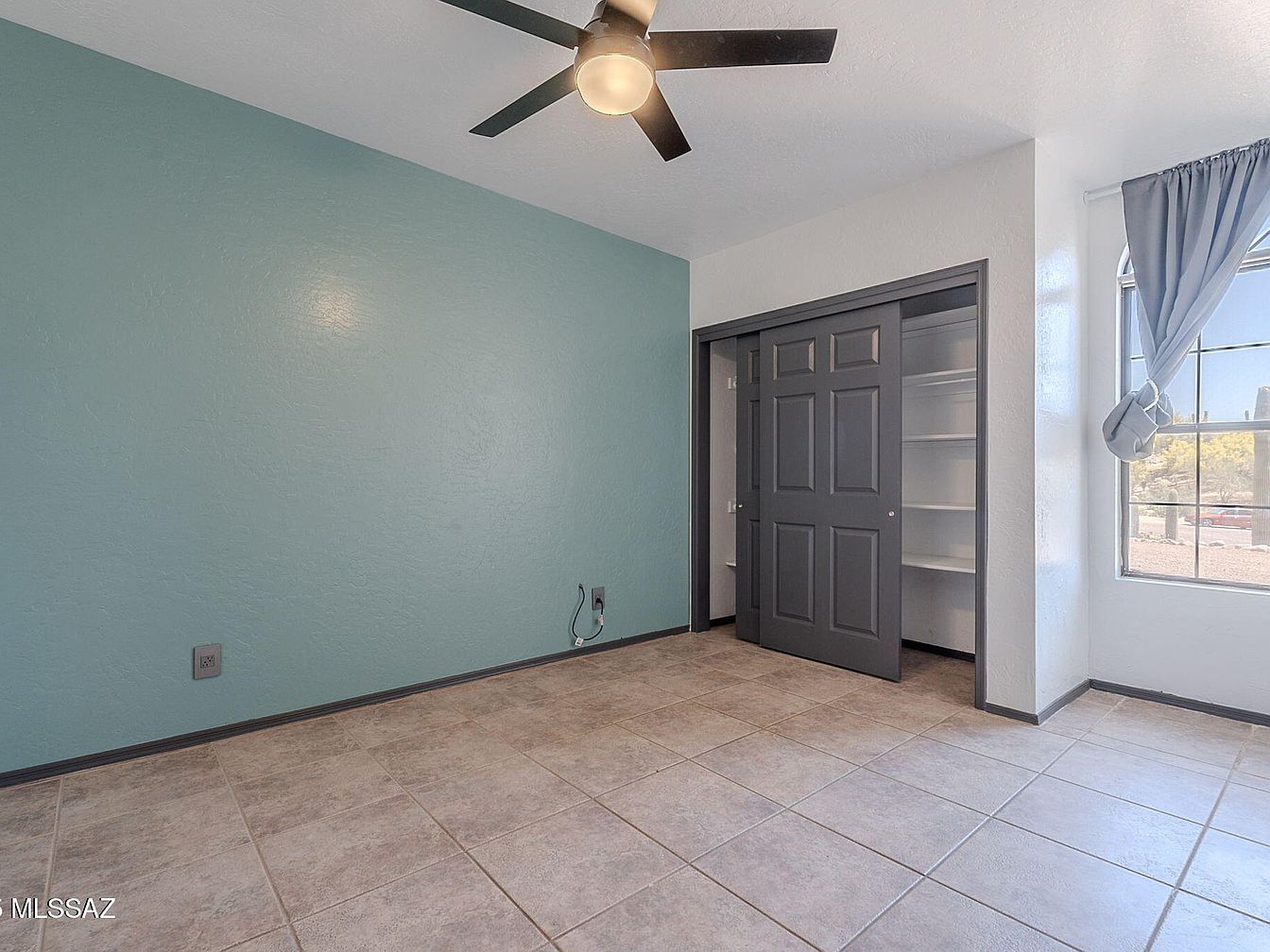 This bedroom corner features a soothing muted teal accent wall paired with soft gray trim and closet doors, creating a modern yet calming vibe. The spacious tiled floor in neutral tones adds durability and ease of maintenance while contributing to the room’s airy feel. The closet is equipped with sliding doors painted in a sleek dark gray, opening to reveal built-in shelving for organized storage. A large window allows natural light to flood the space, dressed lightly with gray curtains tied back. A ceiling fan with black blades and integrated light provides functional comfort and style.