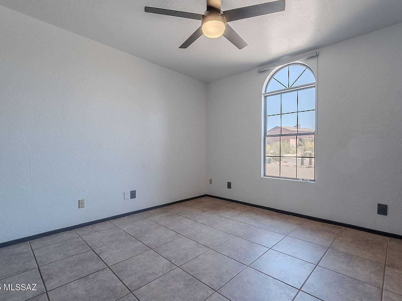This quiet bedroom corner features neutral tones with light gray tiled flooring that extends evenly. The walls are smooth and painted a crisp white, enhancing the room’s brightness. A large arched window with grid detailing brings ample natural light, creating an airy atmosphere and offering a view of the outdoors. The ceiling sports a modern fan with a built-in light, combining function with streamlined style. Simple black trim around floor edges adds subtle contrast. Multiple electrical outlets are conveniently placed around the room, supporting flexible furniture arrangements.