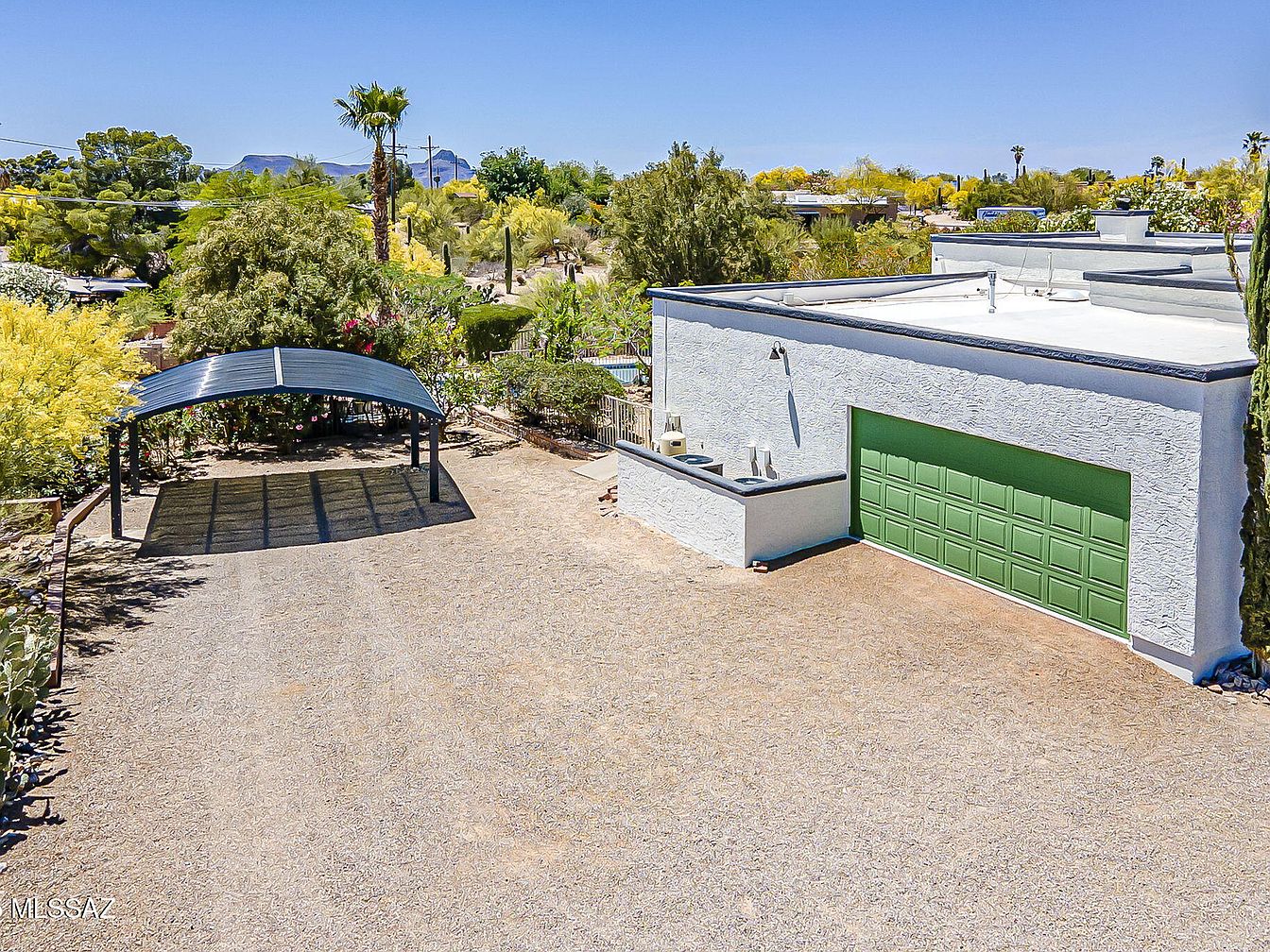 This outdoor space features a white stucco garage with a striking green door that adds a fresh pop of color against the neutral exterior. The flat roof and clean lines contribute to a modern Southwestern style. Adjacent to the garage, a metal carport provides covered parking, blending function with minimalistic design. The expansive gravel driveway offers ample parking space, framed by low retaining walls and lush desert landscaping with various cacti, bushes, and palm trees. Distant mountains and clear blue skies complete the tranquil desert ambiance of this practical yet visually appealing area.