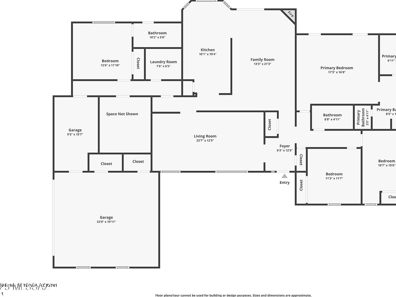 This detailed floor plan reveals a spacious single-story layout featuring a large living room centrally located, measuring approximately 23’7″ by 12’5″. The family room adjacent to the kitchen boasts a cozy corner fireplace and ample space for relaxation or entertainment. The kitchen itself is elongated and practical, facilitating smooth workflow. Bedrooms are positioned for privacy, with a sizable primary bedroom including dual bathrooms and walk-in closets. Additional bedrooms cluster near a shared bathroom, while a notable feature includes a large 22′ by 19’11” garage and a secondary smaller garage. Multiple closets are conveniently placed throughout, enhancing storage solutions within the traditional yet functional home design.