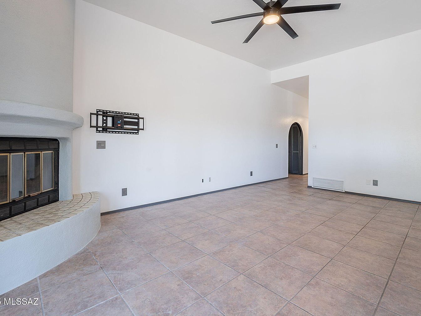 This spacious living room features a neutral color palette with light beige ceramic tile flooring and crisp white walls that enhance the room’s openness. A built-in corner fireplace with a curved mantel and tiled hearth adds architectural interest and a cozy focal point. The ceiling is high and equipped with a modern, black ceiling fan with multiple blades, providing both style and comfort. Subtle gray baseboards and electrical outlets complement the understated design. An arched doorway in the background adds a touch of softness and invites flow between adjoining spaces, exemplifying simple yet elegant Southwestern design.