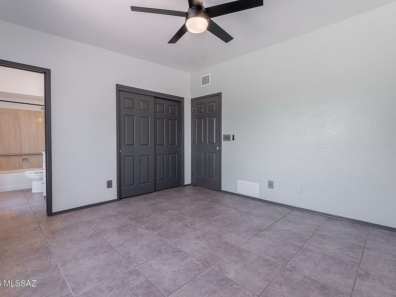 This bedroom features a clean, modern design with large gray floor tiles that extend seamlessly into the connected bathroom, visible through an open doorway. Walls are painted a soft white, creating a bright and airy atmosphere, while the dark gray trim and matching doors add a bold, contrasting accent. The room includes a double-door closet with similar dark gray tones providing ample storage. A sleek black ceiling fan with integrated lighting anchors the ceiling, emphasizing functionality and contemporary style. Ventilation and electrical outlets are subtly incorporated, maintaining the room’s streamlined aesthetic.