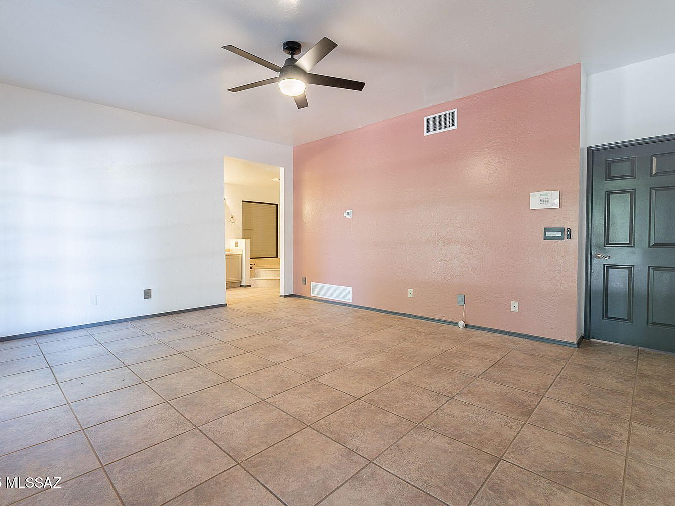 This living area features a spacious, open layout with large, earth-toned tile flooring that adds warmth and durability. The walls are primarily painted white, creating a bright and airy feel, contrasted by an accent wall in a muted dusty pink, adding subtle color interest and depth. A modern black ceiling fan with built-in light sits centrally, blending functionality with sleek design. The gray baseboards and door frame offer a refined border that complements the neutral palette. The room opens up to an adjoining space, visible through an open doorway, hinting at a thoughtful flow between rooms.