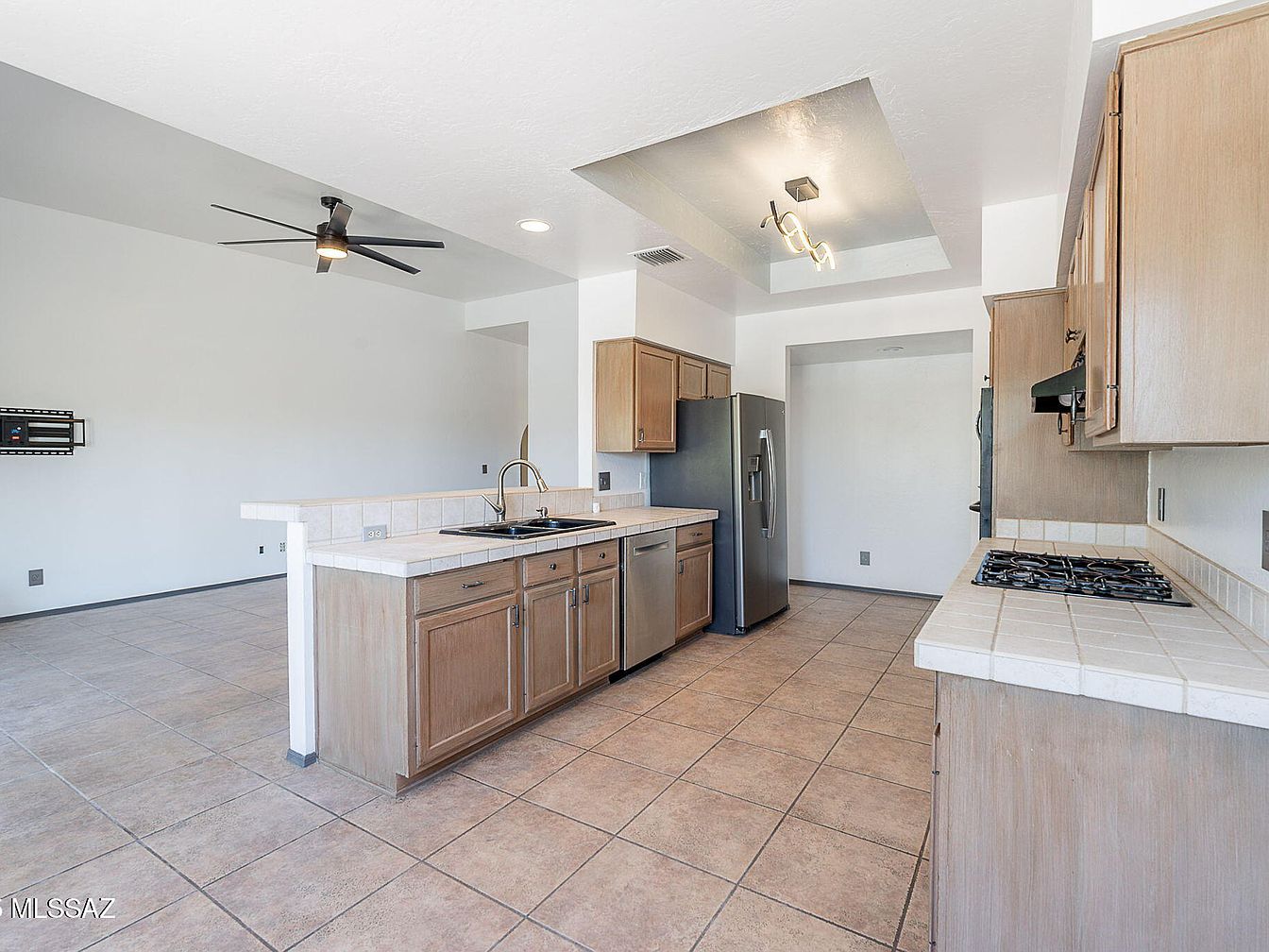 The kitchen combines functionality with a spacious open layout, featuring neutral beige tiled flooring that seamlessly connects to the adjacent room. Light wood cabinetry, offering ample storage, lines the space, complemented by a tiled countertop and backsplash in soft cream tones. A double sink is integrated into a central island that partially separates the kitchen from the adjoining living area. Stainless steel appliances include a refrigerator and dishwasher, enhancing the modern utility of the space. Above, a recessed ceiling with a contemporary light fixture adds subtle architectural interest, while a sleek black ceiling fan provides both style and comfort.