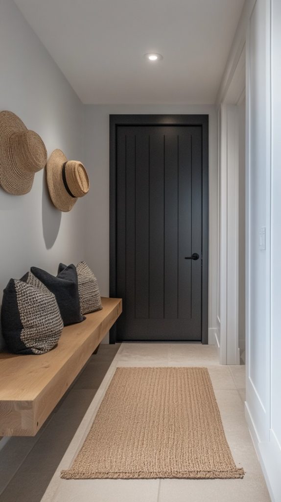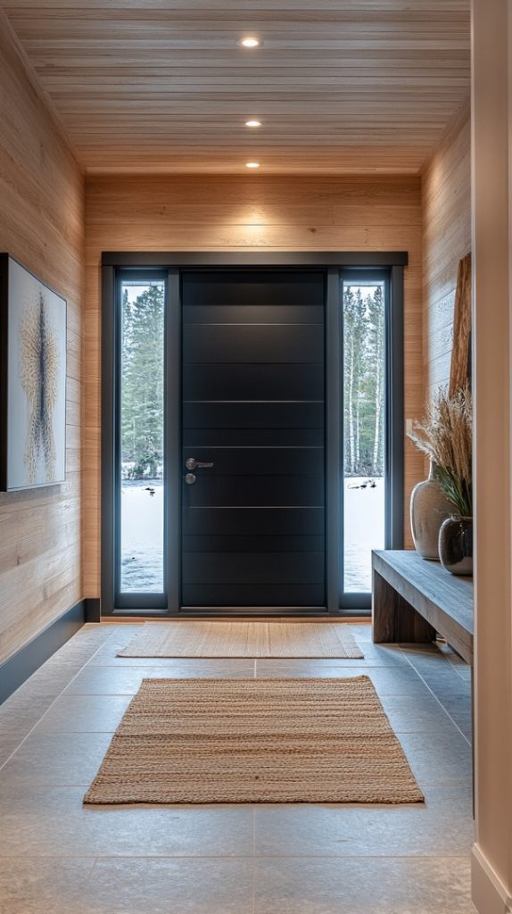 A striking black door sets the tone for this ultra-modern entryway. The clean, minimalist design is elevated by simple decor choices, such as a neutral rug and subtle lighting, which allow the bold architectural details to shine. The monochromatic color scheme gives the space a sleek, sophisticated feel, while the absence of clutter ensures the design remains crisp and timeless. This entryway is ideal for homeowners who appreciate the beauty of simplicity.