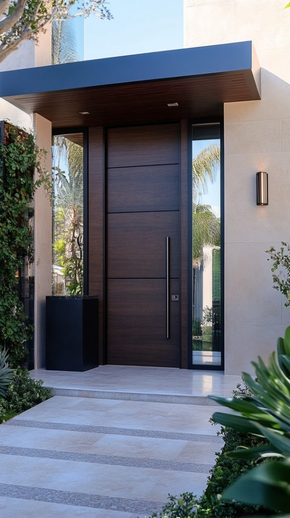 This modern entryway focuses on the beauty of natural materials, with a sleek wooden door serving as the centerpiece. The door’s geometric design adds a contemporary twist, while the warm wood tones keep the space feeling inviting. Flanked by greenery and modern light fixtures, this entryway strikes the perfect balance between organic and modern elements. It’s a simple yet striking design that creates a welcoming first impression with minimal effort.