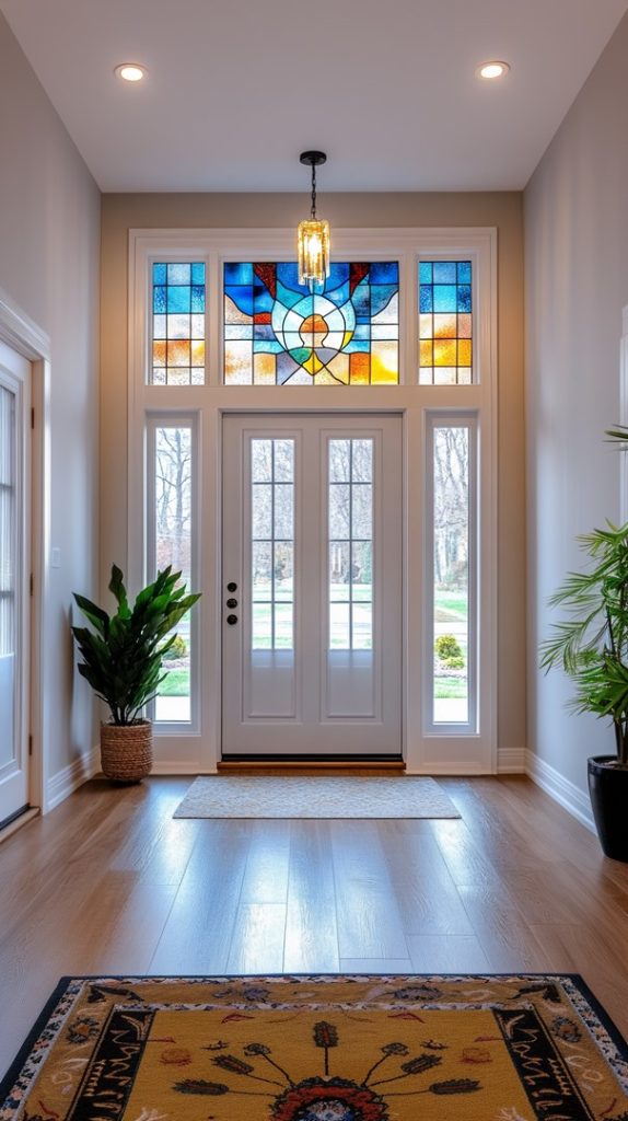 A touch of art deco elegance transforms this modern entryway into a true showstopper. The stained glass above the door adds a splash of color and history, contrasting beautifully with the clean lines and modern materials of the surrounding space. A neutral color palette ensures that the colorful stained glass remains the focal point, while the soft lighting and minimalist furniture keep the design feeling sophisticated and timeless.
