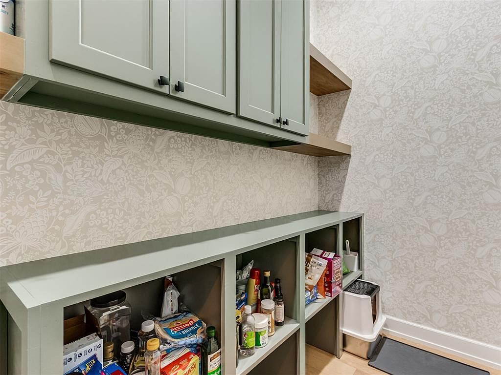 This pantry space features soft sage green cabinetry with sleek black knobs, offering a subtle yet elegant contrast. The upper cabinets provide enclosed storage while the lower open cubbies accommodate pantry essentials visibly yet neatly, balancing accessibility and organization. Natural wood floating shelves add warmth and a contemporary touch, complementing the muted green. The walls are adorned with a delicate, light floral and botanical patterned wallpaper that brings a gentle texture and vintage charm to the nook. A cat litter box area with a mat sits tucked in the corner, demonstrating thoughtful multifunctional use of this compact, well-designed storage corner.