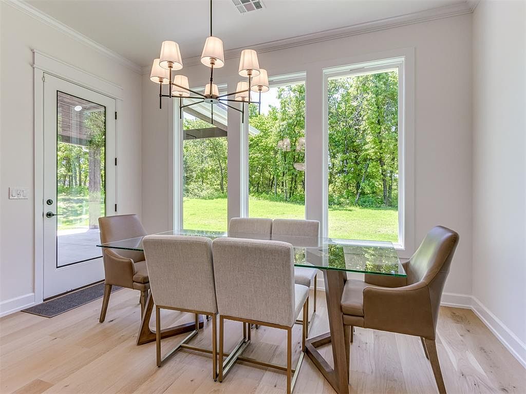 This bright dining space showcases a modern and airy aesthetic, featuring a glass-top table with wooden, geometric legs that add a sculptural element to the room. Surrounding the table are six chairs—four with soft, light gray upholstery and brass legs, paired with two tan leather armchairs at either end, creating a balanced mix of textures. The light wood flooring complements the neutral palette, enhancing the room’s warmth. Large, floor-to-ceiling windows flood the area with natural light and offer a serene view of the lush greenery outside. A central black metal chandelier with eight lampshades provides elegant overhead lighting, completing the sophisticated yet inviting atmosphere.