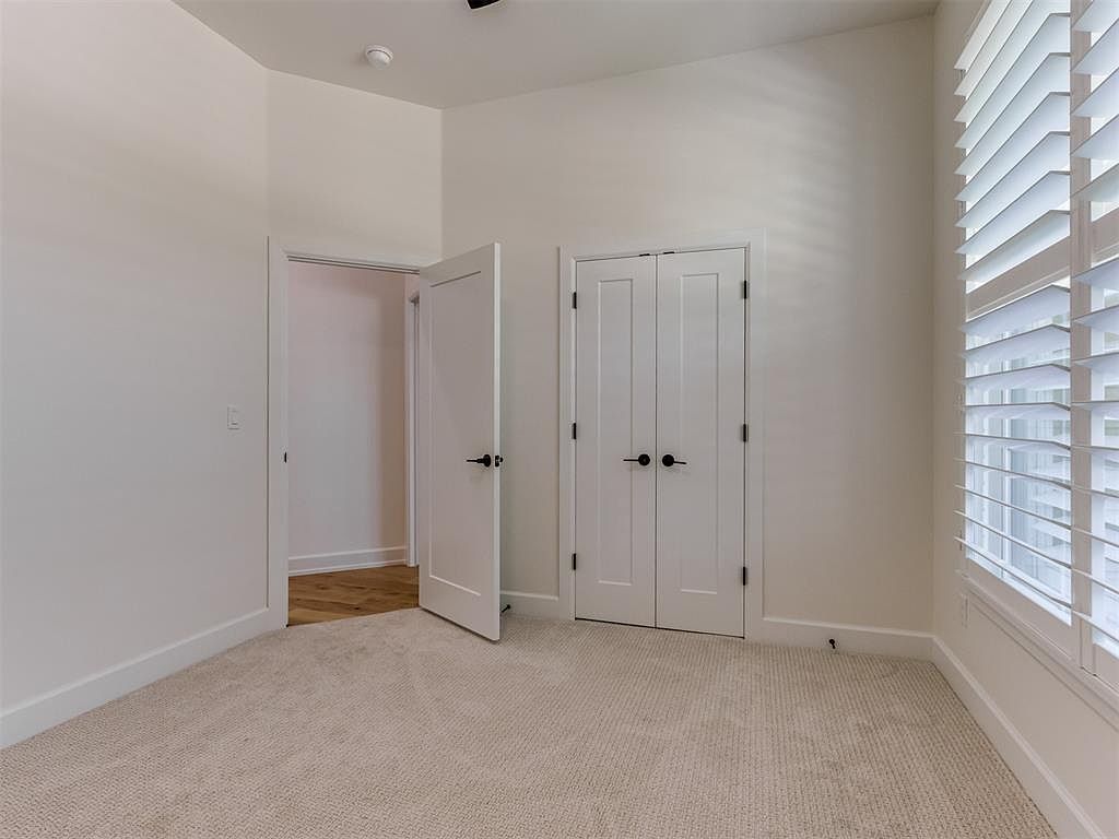 This bedroom corner features a clean, minimalist design highlighted by soft neutral tones. The walls are painted in a gentle off-white, complementing the beige carpet flooring that enhances the cozy atmosphere. Two white double doors with black hardware create a focal point, likely leading to a closet, while an adjacent single door opens into a hallway with warm wood flooring. The large window is dressed with wide white plantation shutters, allowing natural light to filter in softly and adding a touch of classic elegance to the space. Simple baseboards frame the room neatly.