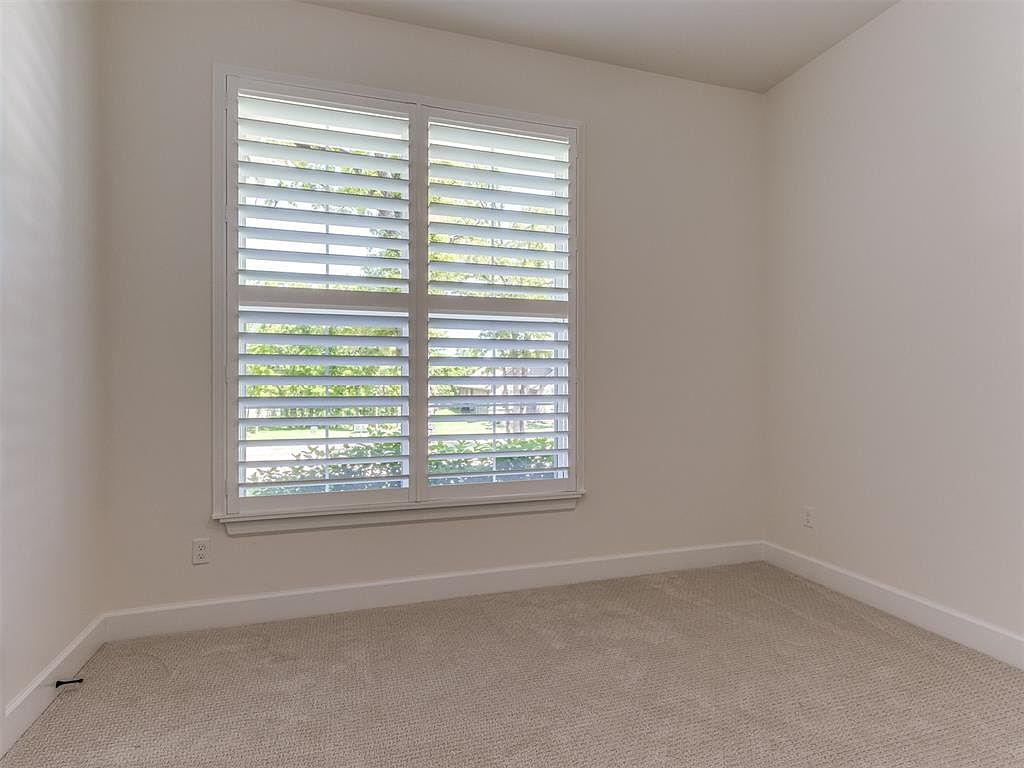 This compact bedroom corner features soft, neutral tones that create a calm and inviting atmosphere. The walls are painted a light beige or off-white, which complements the plush, light gray carpeting that adds warmth and texture underfoot. A sizable window fitted with white plantation shutters ensures plenty of natural light while offering privacy control. The shutters’ clean lines enhance the contemporary simplicity of the space. White baseboards run along the floor, adding a polished finish. Minimalist and bright, this rounded-off corner is ideal for a cozy resting area or a quiet workspace.