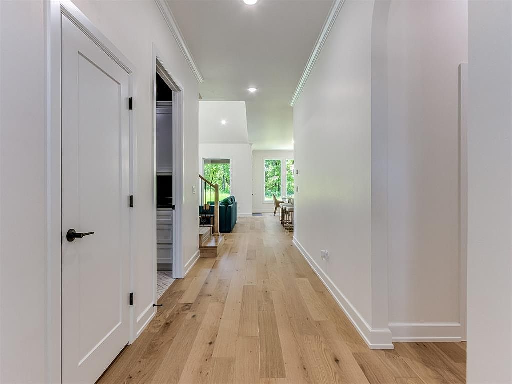 This bright, spacious hallway features light wood flooring that leads naturally towards an open living area with abundant natural light from large windows. Crisp white walls and matching trim contribute to a clean, modern aesthetic, while subtle crown molding adds elegance to the ceiling line. On the left, white doors open to adjacent rooms or closets, with contrasting black hardware providing a minimalist touch. The hallway feels inviting and uncluttered, emphasizing simplicity and openness, with a visual transition from the hallway to a more vibrant, cozy living space beyond.