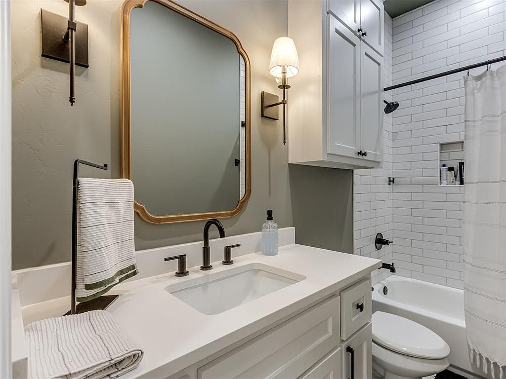 This bathroom features a clean, modern layout with a white vanity topped by a sleek rectangular sink and matte black fixtures. The walls are painted a subtle sage green that complements the warm, rounded-edge wooden frame of the large mirror above the sink. A pair of wall-mounted sconces with fabric shades flank the mirror, adding soft ambient lighting. Adjacent to the vanity is a white cabinet with crisp paneled doors, creating additional storage. The bathtub and shower surround are finished with classic white subway tiles, highlighted by black grout and matching black fixtures, with a built-in niche for toiletries. The overall aesthetic blends contemporary elements with a cozy, timeless charm.