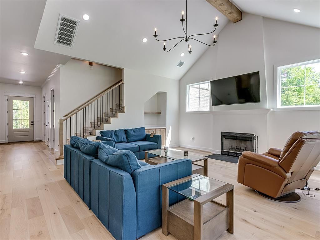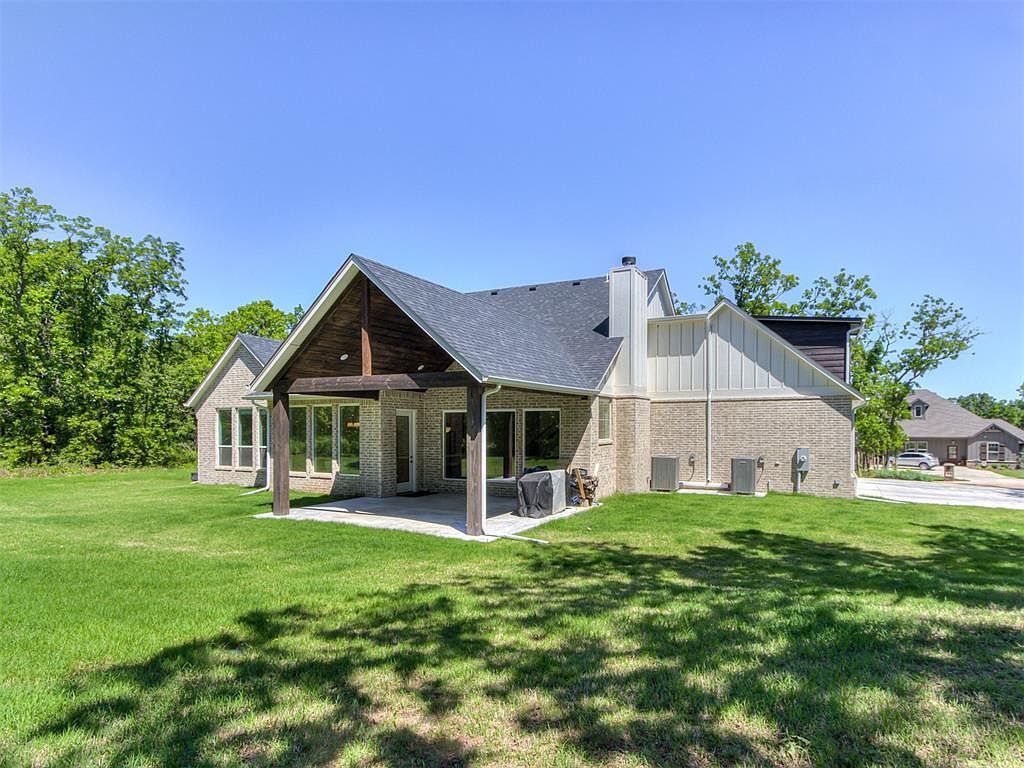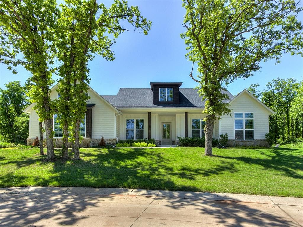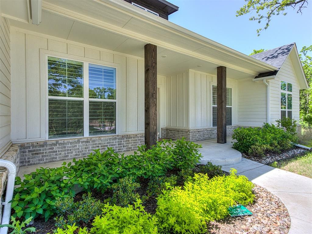 This charming farmhouse-style home, located in Arcadia, Oklahoma, perfectly blends modern elegance with classic country charm. Nestled on a spacious .83-acre lot, the property offers both privacy and convenience, being just a 10-minute drive from all the amenities of Edmond. The home features a thoughtfully designed open concept layout, highlighted by beautiful wood flooring and abundant natural light from large windows throughout. The living room impresses with a vaulted ceiling, an exposed beam, and a cozy fireplace that adds warmth and character. The kitchen is a standout with a large stained wood island equipped with bar seating and a stylish mix of rich wood and crisp white cabinetry, complemented by a generous walk-in pantry for ample storage. The spacious master suite serves as a tranquil retreat, featuring a spa-like bathroom with a double vanity, a luxurious whirlpool soaking tub within a glass-enclosed standing shower, and a massive walk-in closet. Upstairs, a versatile bonus space accompanied by a full bathroom provides endless possibilities such as guest quarters, a game room, or an additional bedroom. Additional highlights include a well-equipped laundry room with ample counter space and storage, a covered back patio with a ceiling fan ideal for peaceful outdoor evenings, custom shutters on the front windows, and stylish shades on the bedroom and upstairs windows to enhance comfort. The septic system was recently serviced in June 2024, and the home remains under its 1-year builder warranty, offering added peace of mind. Listed at $675,000, this home combines premium finishes, an ideal layout, and a prime location, making it a rare and enticing opportunity for prospective buyers.