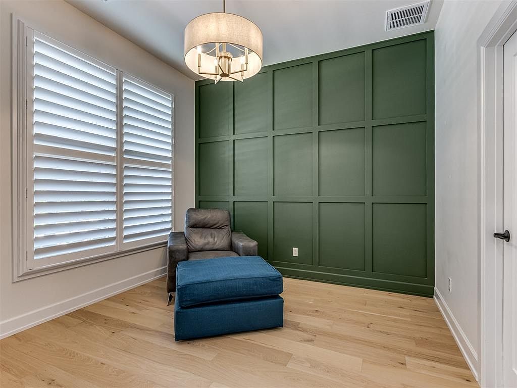 This intimate corner features a chic, deep green accent wall with a grid pattern that adds texture and visual interest. Light wood flooring contrasts beautifully with the bold wall, creating a warm yet modern atmosphere. A large window with white plantation shutters floods the space with natural light while offering privacy. The comfortable dark leather armchair paired with a plush blue ottoman invites relaxation and reading. A soft, drum-shaped ceiling light fixture provides ambient lighting that complements the tranquil and stylish design. The clean lines and subtle color palette emphasize simplicity and comfort.
