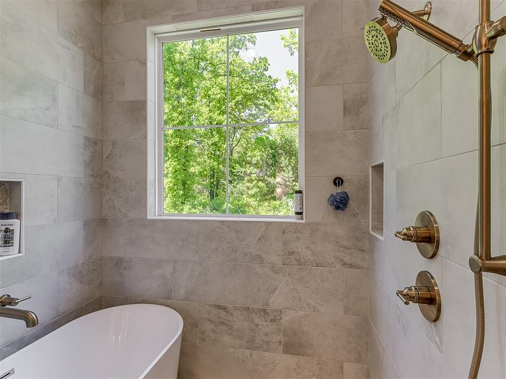 This bright, serene bathroom section features a minimalist bathtub adjacent to a window that frames a lush green outdoor view. The walls are covered in large, light grayish-beige tiles that create a soothing, natural stone effect. Brushed gold fixtures add a touch of elegance, including a rainfall showerhead and dual controls embedded in the tiled wall. Two built-in recessed niches provide practical storage space for shower essentials. The overall aesthetic combines modern luxury with tranquil tones and natural light, making this a refined and inviting bathing area.