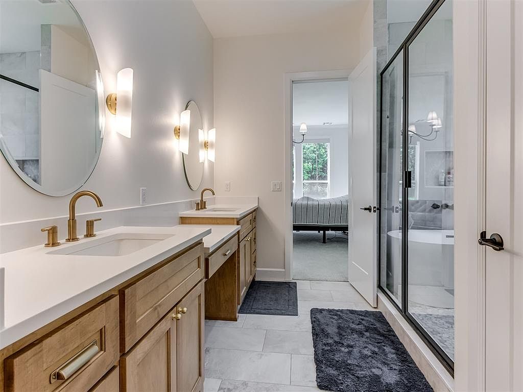 This bathroom features a spacious vanity with dual sinks set into a sleek white countertop. Warm wood cabinetry beneath the counters adds a natural, inviting touch, complemented by contemporary brass fixtures that enhance the overall elegance. Above each sink, large round mirrors reflect soft ambient light from modern wall sconces with gold accents. The floor is laid with light gray tiles that extend into the bright, clean shower area enclosed in glass with black frames. A doorway opens into a bedroom, indicating the bathroom’s layout as a connected master bath suite. Dark, plush rugs add warmth and texture to the cool finishes of this minimalist, tranquil space.