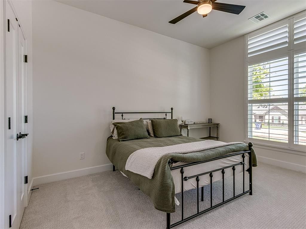 This bedroom features a minimalist and clean design with a soft neutral color palette dominated by white walls and light beige carpeting, creating a bright and airy atmosphere. The centerpiece is a black metal bed frame adorned with olive green bedding and matching pillows, complemented by a white throw blanket for contrast. A small, simple bedside table with a minimalistic design sits next to the bed, holding a few decor items. Natural light floods through the large window fitted with white plantation shutters offering privacy and a serene view outside. The ceiling fan with dark blades adds a modern touch and functional airflow to the space.