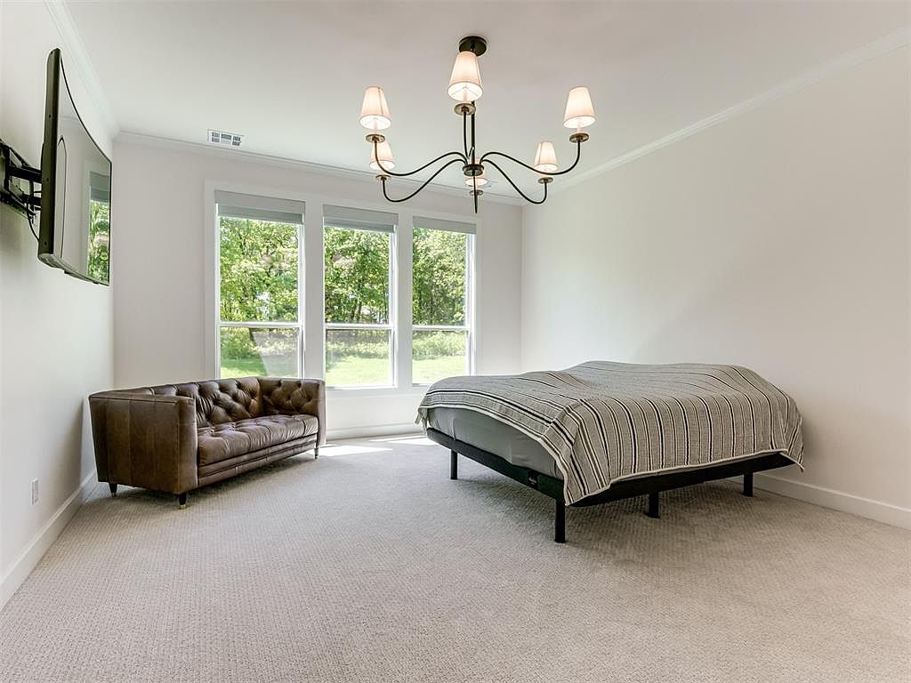 This spacious bedroom features a serene, neutral palette with soft beige carpeting and crisp white walls, creating a calming atmosphere. Three large windows flood the room with natural light and offer a verdant view outside. The bed is minimalistic with a simple black frame and a striped gray bedspread. A classic tufted brown leather sofa adds a sophisticated touch and offers a cozy seating option opposite the bed. A sleek black flat-screen TV is mounted on the wall nearby. Above, a modern chandelier with five lampshades adds an elegant focal point to the ceiling, enhancing the understated elegance of the space.