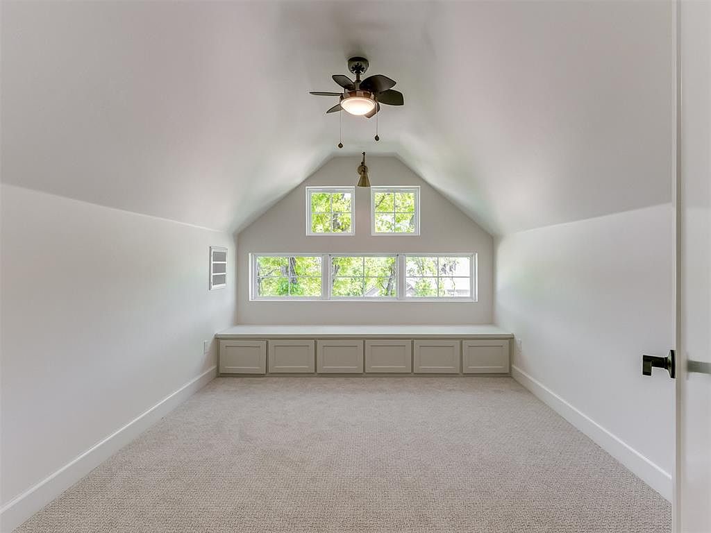 This cozy attic space features a vaulted ceiling with a contemporary ceiling fan and light fixture, offering both air circulation and illumination. The focal point is a bench-style built-in storage unit beneath a set of three horizontally-aligned windows paired with two smaller square windows above, allowing ample natural light and picturesque views of greenery outside. The soft, neutral color palette consists of light gray carpeting and crisp white walls, enhancing the bright and airy atmosphere. The room’s simplicity invites creative use, ideal as a reading nook, quiet retreat, or compact office space.
