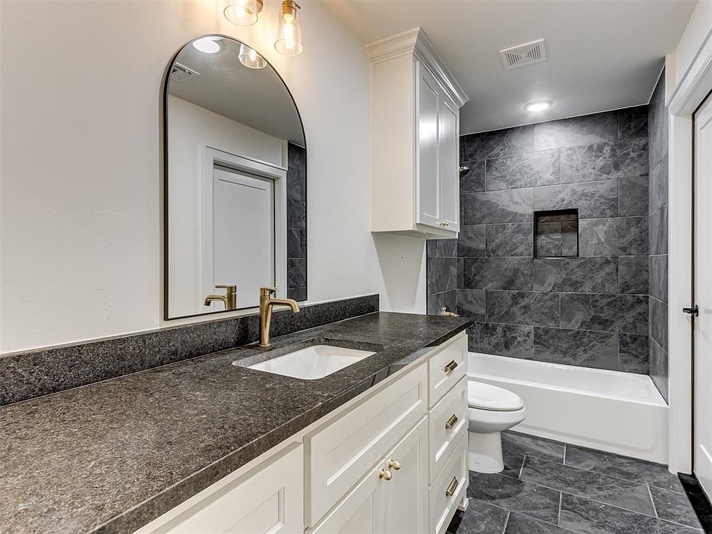 This bathroom features a sleek, modern design with a black granite countertop atop white cabinetry, creating a striking contrast. The vanity boasts a single under-mount sink with a gold-toned, contemporary faucet that complements the subtle brass hardware on the drawers and doors. Above the sink hangs an arched mirror framed in black, adding a soft architectural element against the clean white walls. The bathtub is set within a recess, surrounded by large, dark gray textured tiles that extend to the floor and the shower walls, contributing to a spa-like atmosphere. A built-in niche adds functionality without disrupting the minimalist aesthetic.