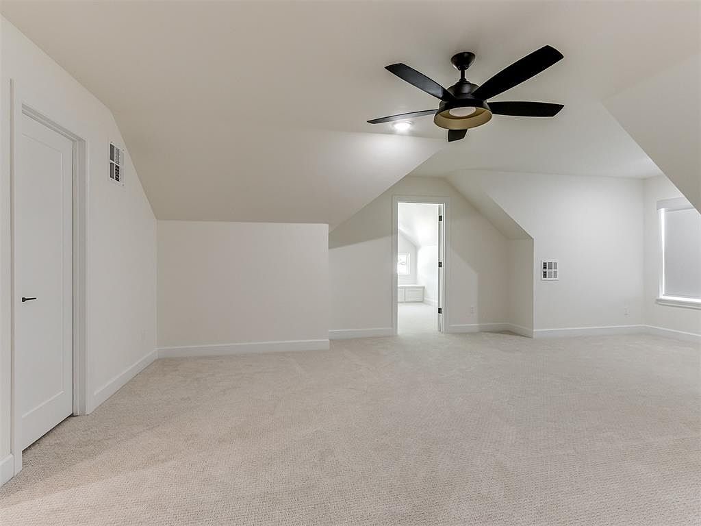 This spacious upstairs loft features soft neutral tones with light beige carpeting and crisp white walls, creating a bright, airy atmosphere. The sloped ceiling angles add architectural character, complemented by a modern black ceiling fan with sleek blades, serving as a focal point. A doorway leads to an adjoining room, enhancing flow and versatility for use as an office or additional bedroom. The window with a simple blind allows natural light while maintaining privacy. Minimalist trim and baseboards provide a clean, understated finish, making the space adaptable for various decorating styles and functions.