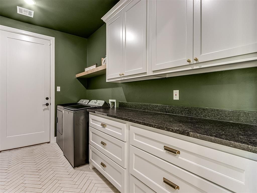 This laundry room features a sophisticated and functional layout, highlighted by deep green walls that create a rich, calming atmosphere. The dark granite countertop stretches over crisp white cabinetry with panel-style doors and modern brass hardware, providing ample workspace and storage. To the left, sleek stainless steel washer and dryer units are tucked beneath a floating wooden shelf perfect for organizing essentials. The floor is adorned with light, herringbone-patterned tiles adding texture and subtle elegance, while the clean white door contrasts beautifully against the darker color palette, enhancing the room’s polished and contemporary look.